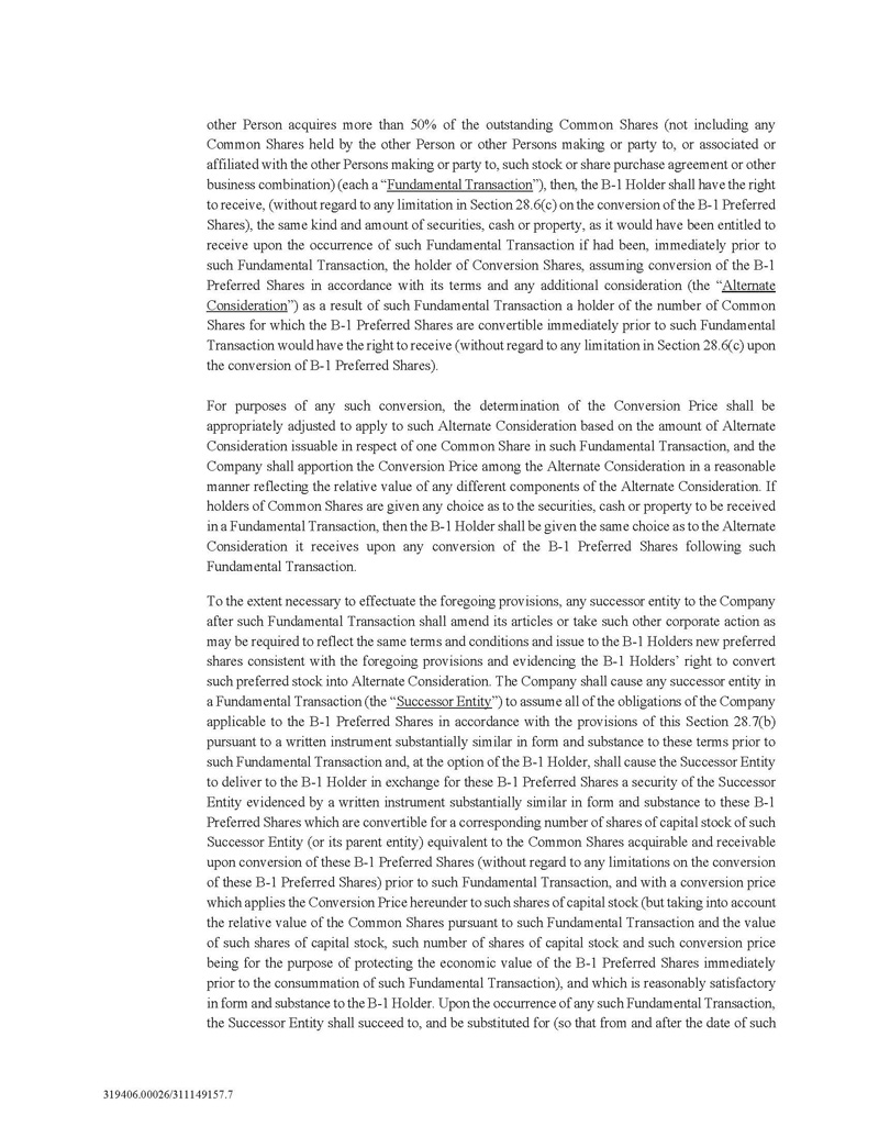 319406.00026/311149157.7 other Per s on acquires more than 50 % of the outstanding Com m on Shares (not inc l uding any Com m on Shares held by the other P e rson or other Persons mak i ng or party to, or associated or affiliated wit h the other Person s mak i ng or party to, such stock or share purchase agreement or other business combination) (each a “ Fundamental Transaction ”), then , the B - 1 Holder shal l have the right t o receive, (withou t regard to any limitatio n in Secti on 28 . 6 (c) o n the conversion of the B - 1 Preferred Shares), the same kin d and amoun t of securities, cash or property, as it wou l d have been entitle d to receive upon the occurrence of such Fund a mental Transaction if had been, immediate l y prior to such Fundamental Transaction, the holder of Conve r s i on Shares, assuming conversion of the B - 1 Preferred Shares i n accordance wit h it s term s and any additional consideration (the “ Alternate Consideration ”) as a resul t of such Fundamenta l Transaction a holder of the number of Common Shares for which the B - 1 Preferred Shares are convertible immediately prior to such Fundamental Transaction wou l d have the right to receive (without regard to any limitation in Section 28 . 6 (c) upon the conversion of B - 1 Preferred Shares) . For purposes of any such conversion, the determination of the Conversion Price shall be appropriately adjusted to apply to such Alternate Consideration based on the amount of Alternate Consideration issuable in respect of one Common Share in such Fundamental Transaction, and the Company shall apportion the Conversion Price among the Alternate Consideration in a reasonable manner reflecting the relative value of any different components of the Alternate Consideration . If holders of Common Shares are given any choice as to the securities, cash or property to be received in a Fundamental Transaction, then the B - 1 Holder shall be given the same choice as to the Alternate Consideration it receives upon any conversion of the B - 1 Preferred Shares following such Fundamental Transaction . T o the extent necessary t o effectuate the foregoing provisions , any successor entit y to the Company after such Fundamenta l Transaction shal l amend it s articles or take such other corporate action as ma y be required to reflect the same term s and conditions and issu e to the B - 1 Holders new preferred shares consistent wi t h the foregoing provisions and evidencing the B - 1 Holders’ right t o convert such preferred stock in t o Alternate Consideration . The Comp a ny shall cause any successor entity in a Fundamenta l Transaction (the “ Successor Entity ”) to assum e al l of the obligation s of the Compa n y applicable t o the B - 1 Preferred Shares i n accordance wi t h the provision s of thi s Sec t io n 28 . 7 (b) pursuant t o a writte n instrument substantially similar i n form and substance t o these terms prior to such Fundamental Transaction and, at the o pti on of the B - 1 Holder, s h al l cause the Successor E n tity t o deliver to the B - 1 Holder in exchange for these B - 1 Preferred Shares a security of the Successor E n tit y evidenced by a writte n instrument substantially s i mila r i n form and substance t o these B - 1 Preferred Shares which are convertible for a corresponding number of shares of capital stock of such Successor Ent i ty (or its parent entity) equivalent to the Common Shares acquirable and receivable u po n conversion of these B - 1 Preferred Shares (without regard t o any limitati ons o n the conversion of these B - 1 Preferred Shares) prior to such Fund a mental Transaction, and with a conversion price which applies the Conve r sion Price hereunder to such shares of capital sto c k (but tak i ng into account the relative value of the C o mmo n Shares pursuan t t o such Fundamenta l Transaction and the value of such shares of capital sto c k, such number of shares of capital stock and such conversion price bein g for the purpose of protecting the economic value of the B - 1 Preferred Shares immediately prior to the consummation of such Fundamental Transaction), and which is reasonably satisfactory i n form and substance t o the B - 1 Holder . Upo n the occurrence of any such Fundamental Transaction, the Successor Entit y shall succeed to, and be substitute d for (so tha t from and after the date of such