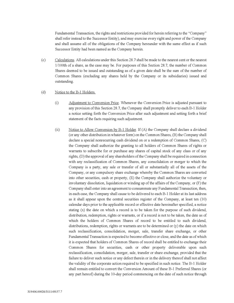 319406.00026/311149157.7 Fundamental Transaction, the rights and restrictions provided for herein referring to the “Company” shall refer instead to the Successor Entity), and may exercise every right and power of the Company and shall assume all of the obligations of the Company hereunder with the same effect as if such Successor Entity had been named as the Company herein . (c) Calculations . All calculations under this Section 28 . 7 shall be made to the nearest cent or the nearest 1 / 100 th of a share, as the case may be . For purposes of this Section 28 . 7 , the number of Common Shares deemed to be issued and outstanding as of a given date shall be the sum of the number of Common Shares (excluding any shares held by the Company or its subsidiaries) issued and outstanding . (d) Notice to the B - 1 Holders. (i) Adjustment to Conversion Price . Whenever the Conversion Price is adjusted pursuant to any provision of this Section 28 . 7 , the Company shall promptly deliver to each B - 1 Holder a notice setting forth the Conversion Price after such adjustment and setting forth a brief statement of the facts requiring such adjustment . (ii) Notice to Allow Conversion by B - 1 Holder . If (A) the Company shall declare a dividend (or any other distribution in whatever form) on the Common Shares, (B) the Company shall declare a special nonrecurring cash dividend on or a redemption of Common Shares, (C) the Company shall authorize the granting to all holders of Common Shares of rights or warrants to subscribe for or purchase any shares of capital stock of any class or of any rights, (D) the approval of any shareholders of the Company shall be required in connection with any reclassification of Common Shares, any consolidation or merger to which the Company is a party, any sale or transfer of all or substantially all of the assets of the Company, or any compulsory share exchange whereby the Common Shares are converted into other securities, cash or property, (E) the Company shall authorize the voluntary or involuntary dissolution, liquidation or winding up of the affairs of the Company, or (F) the Company shall enter into an agreement to consummate any Fundamental Transaction, then, in each case, the Company shall cause to be delivered to each B - 1 Holder at its last address as it shall appear upon the central securities register of the Company, at least ten ( 10 ) calendar days prior to the applicable record or effective date hereinafter specified, a notice stating (x) the date on which a record is to be taken for the purpose of such dividend, distribution, redemption, rights or warrants, or if a record is not to be taken, the date as of which the holders of Common Shares of record to be entitled to such dividend, distributions, redemption, rights or warrants are to be determined or (y) the date on which such reclassification, consolidation, merger, sale, transfer share exchange, or other Fundamental Transaction is expected to become effective or close, and the date as of which it is expected that holders of Common Shares of record shall be entitled to exchange their Common Shares for securities, cash or other property deliverable upon such reclassification, consolidation, merger, sale, transfer or share exchange, provided that the failure to deliver such notice or any defect therein or in the delivery thereof shall not affect the validity of the corporate action required to be specified in such notice . The B - 1 Holder shall remain entitled to convert the Conversion Amount of these B - 1 Preferred Shares (or any part hereof) during the 10 - day period commencing on the date of such notice through