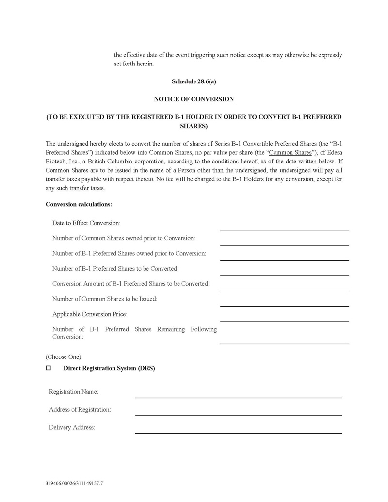 the effective date of the event triggering such notice except as may otherwise be expressly set forth herein. Schedule 28.6(a) NOTICE OF CONVERSION (TO BE EXECUTED BY THE REGISTERED B - 1 HOLDER IN ORDER TO CONVERT B - 1 PREFERRED SHARES) The undersigned hereby elects to convert the number of shares of Series B - 1 Convertible Preferred Shares (the “B - 1 Preferred Shares”) indicated below into Common Shares, no par value per share (the “ Common Shares ”), of Edesa Biotech, Inc . , a British Columbia corporation, according to the conditions hereof, as of the date written below . If Common Shares are to be issued in the name of a Person other than the undersigned, the undersigned will pay all transfer taxes payable with respect thereto . No fee will be charged to the B - 1 Holders for any conversion, except for any such transfer taxes . Conversion calculations : Date to Effect Conversion: Number of Common Shares owned prior to Conversion: Number of B - 1 Preferred Shares owned prior to Conversion: Number of B - 1 Preferred Shares to be Converted: Conversion Amount of B - 1 Preferred Shares to be Converted: Number of Common Shares to be Issued: Applicable Conversion Price: Number of B - 1 Preferred Shares Remaining Following Conversion: (Choose One)  Direct Registration System (DRS) Registration Name: Address of Registration: Delivery Address: 319406.00026/311149157.7