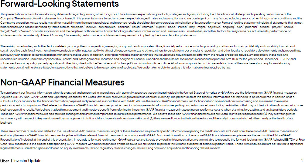 2 Investor Update This presentation contains forward - looking statements regarding, among other things, our future business expectations, products, strategies and goals, including the future financial, strategic and operating performance of the Company. These forward - looking statements contained in this presentation are based on current expectations, estimates and as sumptions and are contingent on many factors, including, among other things, market conditions and the Company’s execution. Actual results may differ materially from the results predicted, and reported results sh ould not be considered as an indication of future performance. Forward - looking statements include all statements that are not historical facts and can be identified by terms such as “anticipate,” “believe,” “contemp lat e,” “continue,” “could,” “estimate,” “expect,” “hope,” “intend,” “may,” “might,” “objective,” “ongoing,” “plan,” “potential,” “predict,” “project,” “should,” “target,” “will,” or “would” or similar expressions and the negatives of th ose terms. Forward - looking statements involve known and unknown risks, uncertainties, and other factors that may cause our actual results, performance, or achievements to be materially different from any future results, p erf ormance, or achievements expressed or implied by the forward - looking statements. These risks, uncertainties, and other factors relate to, among others: competition; managing our growth and corporate culture ; f inancial performance, including our ability to attain and sustain profitability and our ability to attain and sustain positive cash flow; investments in new products or offerings; our ability to attract drivers, consumers, a nd other partners to our platform; our brand and reputation and other legal and regulatory developments and proceedings, particularly with respect to our relationships with drivers and couriers. In addition, other po ten tial risks and uncertainties that could cause actual results to differ from the results predicted include, among others, those risks and uncertainties included under the captions “Risk Factors” and “Management’s Discussion and Analysis of Financial Condition and Results of Operations” in our annual report on Form 10 - K for the year ended December 31, 2022, and subsequent annual reports, quarterly reports and other filings filed with the Sec urities and Exchange Commission from time to time. All information provided in this presentation is as of the date hereof and any forward - looking statements contained herein are based on assumptions that we belie ve to be reasonable as of such date. We undertake no duty to update this information unless required by law. Forward - Looking Statements Non - GAAP Financial Measures To supplement our financial information, which is prepared and presented in accordance with generally accepted accounting pri nci ples in the United States of America, or GAAP, we use the following non - GAAP financial measures: Adjusted EBITDA; Non - GAAP Costs and Operating Expenses; Free Cash Flow; as well as revenue growth rates in constant cu rrency. The presentation of this financial information is not intended to be considered in isolation or as a substitute for, or superior to, the financial information prepared and presented in accordanc e w ith GAAP. We use these non - GAAP financial measures for financial and operational decision - making and as a means to evaluate period - to - period comparisons. We believe that these non - GAAP financial measures provide meanin gful supplemental information regarding our performance by excluding certain items that may not be indicative of our recurring core business operating results. We believe that both management and investors be nef it from referring to these non - GAAP financial measures in assessing our performance and when planning, forecasting, and analyzing future periods. These non - GAAP financial measures also facilitate management’s interna l comparisons to our historical performance. We believe these non - GAAP financial measures are useful to investors both because (1) they allow for greater transparency with respect to key metrics used by man age ment in its financial and operational decision - making and (2) they are used by our institutional investors and the analyst community to help them analyze the health of our business. There are a number of limitations related to the use of non - GAAP financial measures. In light of these limitations we provide sp ecific information regarding the GAAP amounts excluded from these non - GAAP financial measures and evaluating these non - GAAP financial measures together with their relevant financial measures in accordance with GAA P. For more information on these non - GAAP financial measures, please see the section titled “Non - GAAP Reconciliations” included at the end of this presentation. In regards to forward looking non - GAAP guid ance and targets provided in this presentation, we are not able to reconcile the forward - looking non - GAAP Adjusted EBITDA or Free Cash Flow measures to the closest corresponding GAAP measure without unreasonable effo rts because we are unable to predict the ultimate outcome of certain significant items. These items include, but are not limited to significant legal settlements, unrealized gains and losses on equity inve stm ents, tax and regulatory reserve changes, restructuring costs and acquisition and financing related impacts.