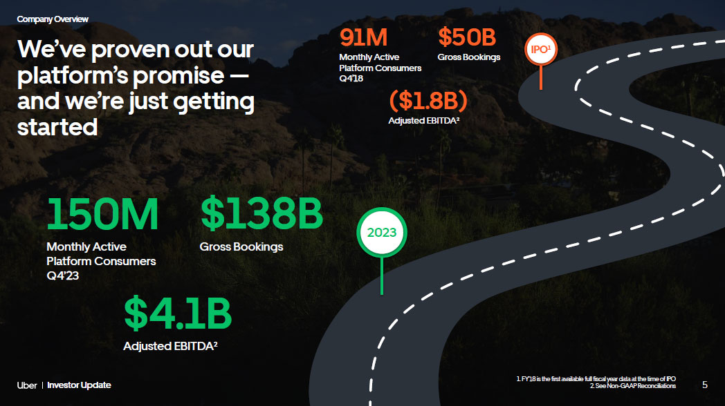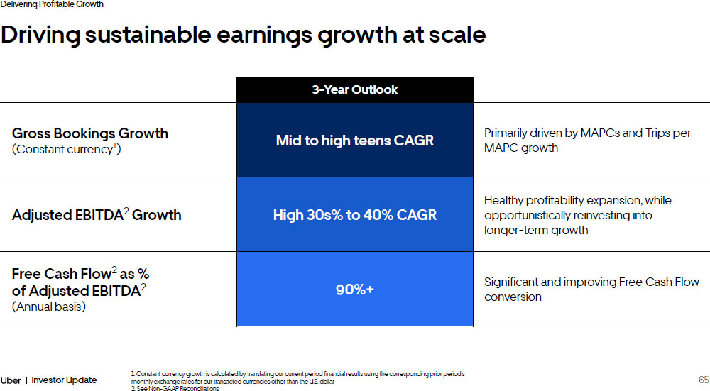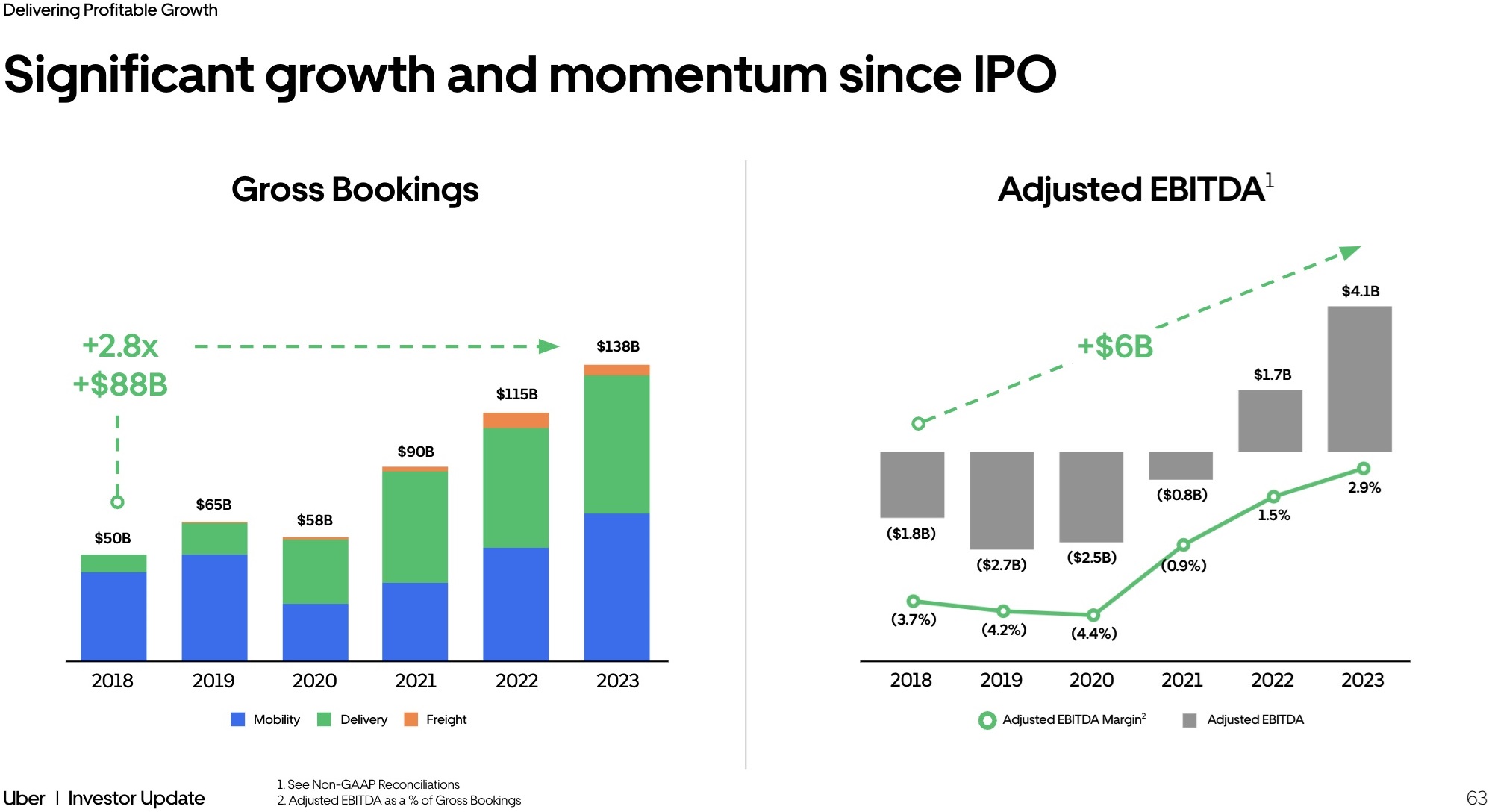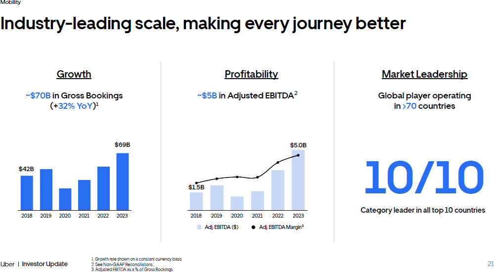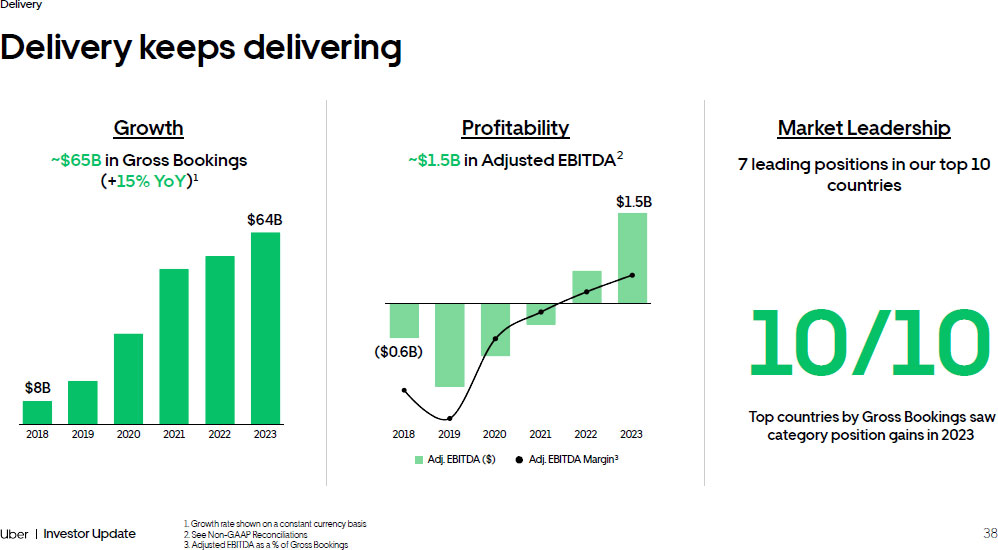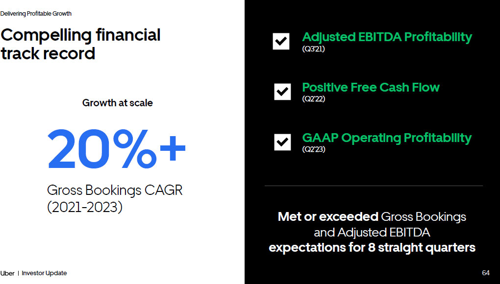 63 Investor Update Delivering Profitable Growth Significant growth and momentum since IPO 1. See Non - GAAP Reconciliations 2. Adjusted EBITDA as a % of Gross Bookings Mobility Gross Bookings +2.8x +$88B Adjusted EBITDA 1 +$6B 2018 2019 2020 2021 2022 2023 2018 2019 2020 2021 2022 2023 Adjusted EBITDA Margin 2 Adjusted EBITDA ($1.8B) ($2.7B) ($2.5B) ($0.8B) $1.7B $4.1B (3.6%) (4.3%) (4.4%) (0.9%) 1.5% 3.0% $138B $115B $90B $58B $65B $50B Delivery Freight