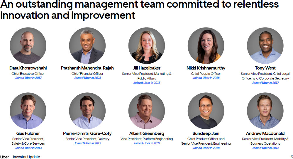 6 Investor Update An outstanding management team committed to relentless innovation and improvement Dara Khosrowshahi Chief Executive Officer Joined Uber in 2017 Prashanth Mahendra - Rajah Chief Financial Officer Joined Uber in 2023 Jill Hazelbaker Senior Vice President, Marketing & Public Affairs Joined Uber in 2015 Nikki Krishnamurthy Chief People Officer Joined Uber in 2018 Tony West Senior Vice President, Chief Legal Officer, and Corporate Secretary Joined Uber in 2017 Gus Fuldner Senior Vice President, Safety & Core Services Joined Uber in 2013 Pierre - Dimitri Gore - Coty Senior Vice President, Delivery Joined Uber in 2012 Albert Greenberg Vice President, Platform Engineering Joined Uber in 2021 Sundeep Jain Chief Product Officer and Senior Vice President, Engineering Joined Uber in 2018 Andrew Macdonald Senior Vice President, Mobility & Business Operations Joined Uber in 2012