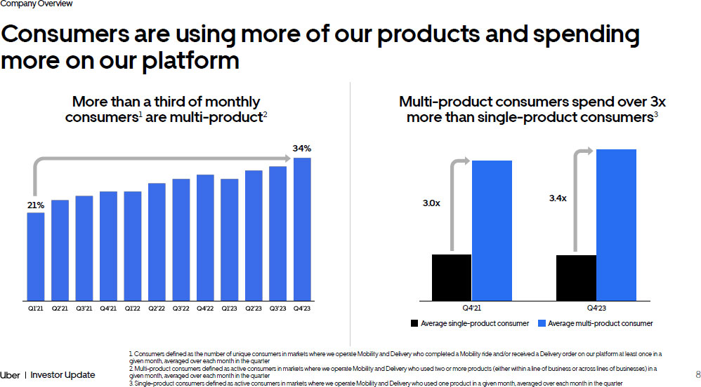 Company Overview 8 Investor Update Consumers are using more of our products and spending more on our platform 1. Consumers defined as the number of unique consumers in markets where we operate Mobility and Delivery who completed a Mobi lit y ride and/or received a Delivery order on our platform at least once in a given month, averaged over each month in the quarter 2. Multi - product consumers defined as active consumers in markets where we operate Mobility and Delivery who used two or more pr oducts (either within a line of business or across lines of businesses) in a given month, averaged over each month in the quarter 3. Single - product consumers defined as active consumers in markets where we operate Mobility and Delivery who used one product i n a given month, averaged over each month in the quarter More than a third of monthly consumers ¹ are multi - product ² Multi - product consumers spend over 3x more than single - product consumers ³ 3.0x 3.4x Q4’21 Q4’23 Average single - product consumer Average multi - product consumer 34% 21%