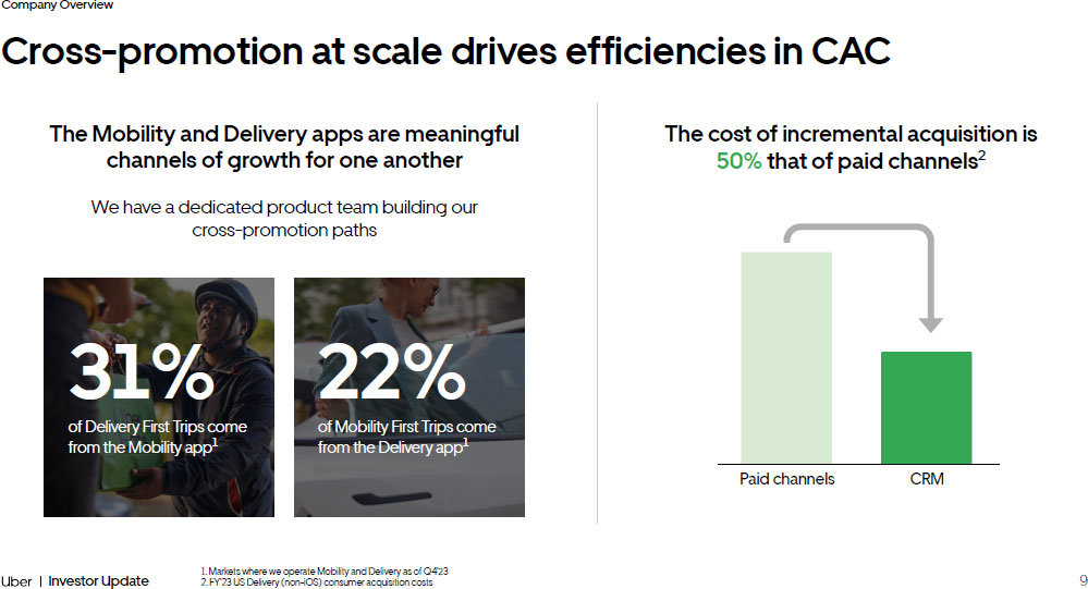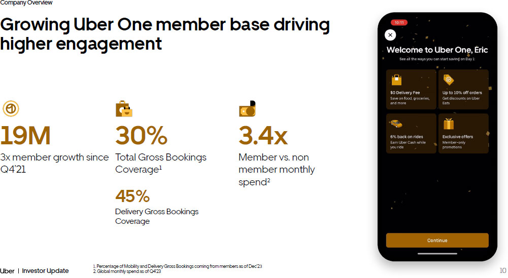 Company Overview 9 Investor Update Cross - promotion at scale drives efficiencies in CAC The Mobility and Delivery apps are meaningful channels of growth for one another We have a dedicated product team building our cross - promotion paths The cost of incremental acquisition is 50% that of paid channels 2 1. Markets where we operate Mobility and Delivery as of Q4’23 2. FY’23 US Delivery (non - iOS) consumer acquisition costs 31% of Delivery First Trips come from the Mobility app 1 22% of Mobility First Trips come from the Delivery app 1 Paid channels CRM