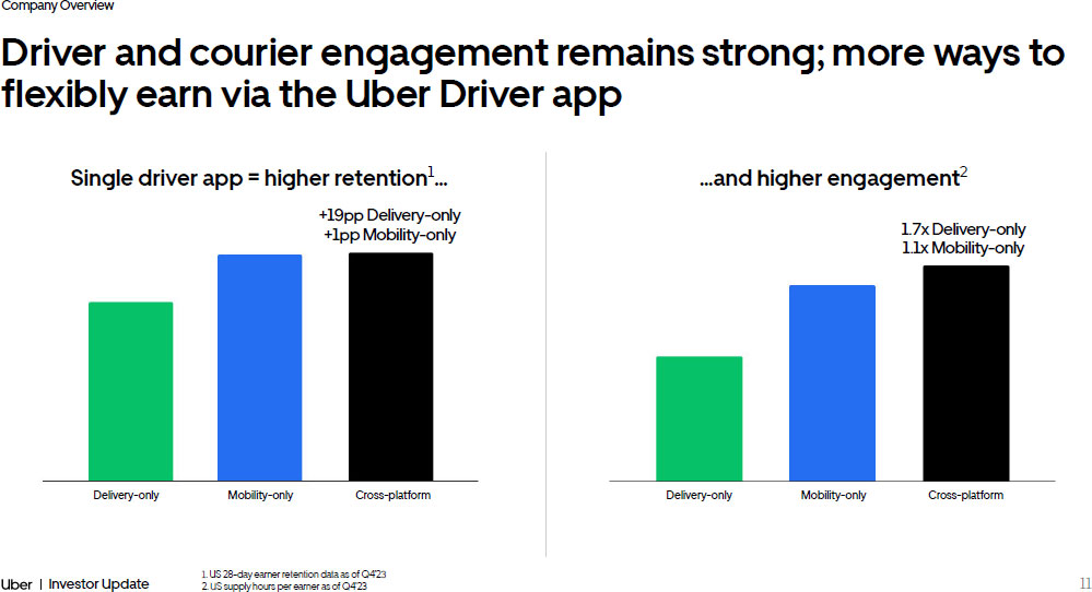 Company Overview 10 Investor Update Growing Uber One member base driving higher engagement 1. Percentage of Mobility and Delivery Gross Bookings coming from members as of Dec’23 2. Global monthly spend as of Q4’23 19M 3x member growth since Q4’21 30% Total Gross Bookings Coverage¹ 3.4x Member vs. non member monthly spend² 45% Delivery Gross Bookings Coverage