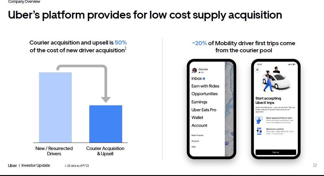 Company Overview 11 Investor Update Driver and courier engagement remains strong; more ways to flexibly earn via the Uber Driver app 1.7x Delivery - only 1.1x Mobility - only …and higher engagement 2 Delivery - only Mobility - only Cross - platform Single driver app = higher retention 1 … +19pp Delivery - only +1pp Mobility - only Delivery - only Mobility - only Cross - platform 1. US 28 - day earner retention data as of Q4’23 2. US supply hours per earner as of Q4’23