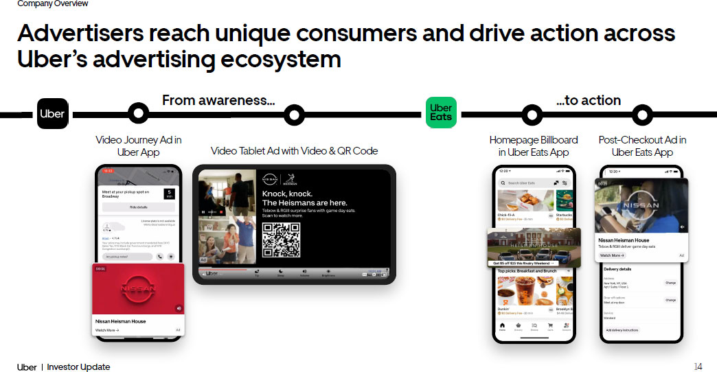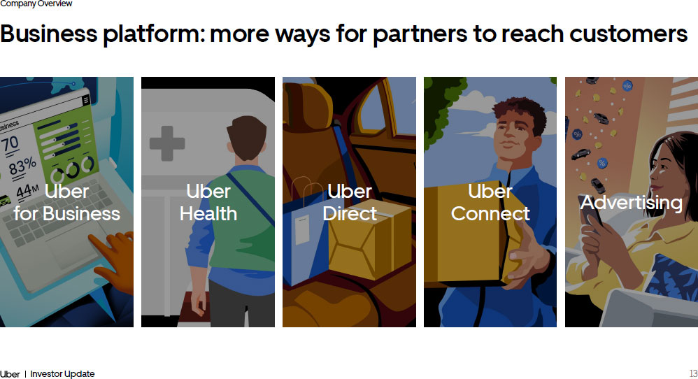 Company Overview 13 Investor Update Business platform: more ways for partners to reach customers Uber for Business Uber Health Uber Connect Advertising Uber Direct