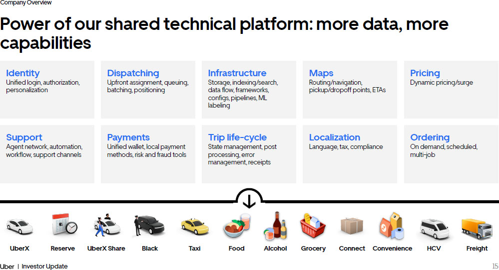 Company Overview 15 Investor Update Power of our shared technical platform: more data, more capabilities UberX Reserve UberX Share Black Taxi HCV Food Alcohol Connect Convenience Grocery Freight Identity Unified login, authorization, personalization Dispatching Upfront assignment, queuing, batching, positioning Infrastructure Storage, indexing/search, data flow, frameworks, configs, pipelines, ML labeling Maps Routing/navigation, pickup/dropoff points, ETAs Pricing Dynamic pricing/surge Support Agent network, automation, workflow, support channels Payments Unified wallet, local payment methods, risk and fraud tools Trip life - cycle State management, post processing, error management, receipts Localization Language, tax, compliance Ordering On demand, scheduled, multi - job