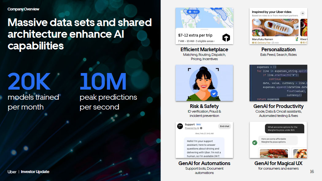 Company Overview 16 Investor Update Massive data sets and shared architecture enhance AI capabilities peak predictions per second 10M models trained per month 20K 16 Company Overview 16 Investor Update Personalization Eats Feed, Search, Rides Efficient Marketplace Matching, Routing, Dispatch, Pricing, Incentives Risk & Safety ID verification, Fraud & incident prevention GenAI for Productivity Code, Data & Oncall assistants, Automated testing & fixes GenAI for Automations Support bots, Document automations GenAI for Magical UX for consumers and earners