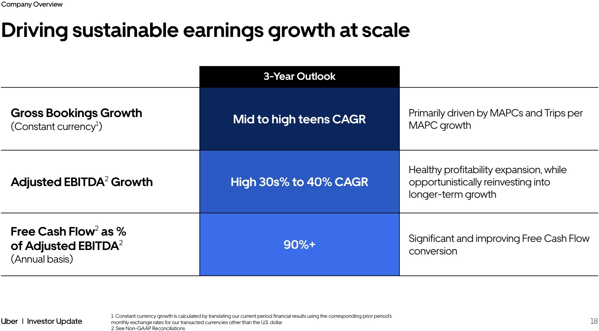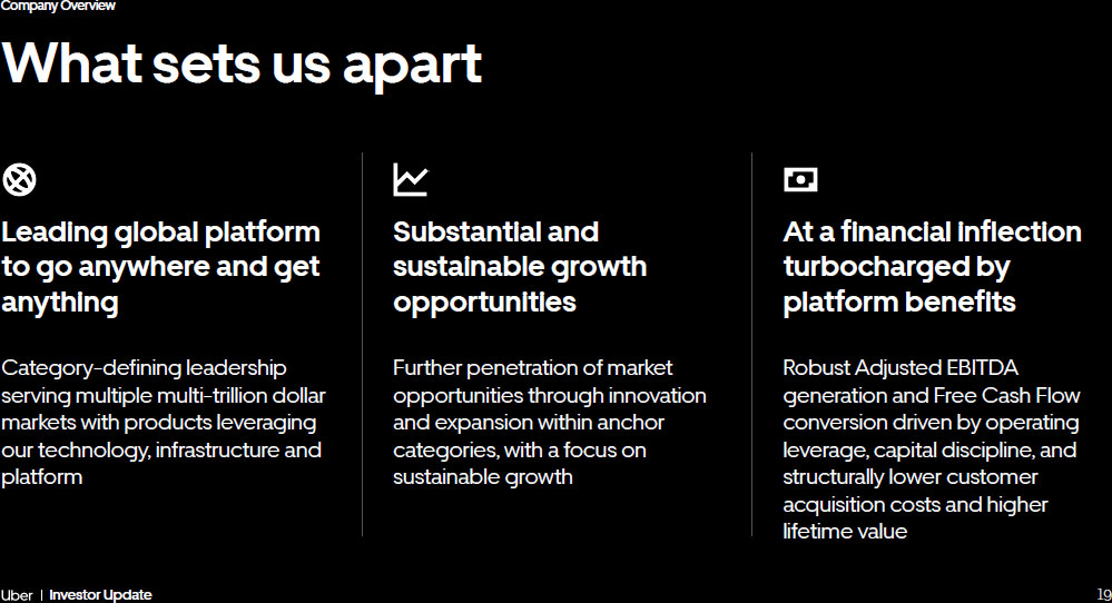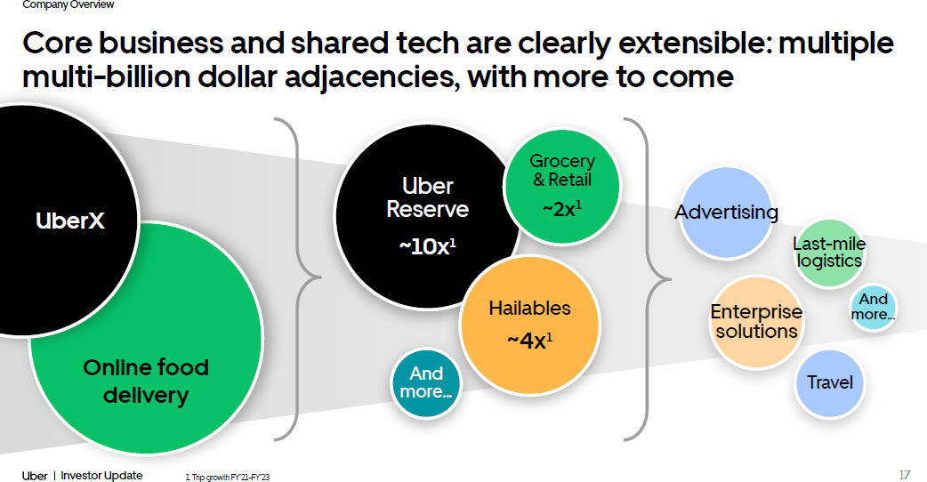 Company Overview 17 Investor Update Online food delivery Core business and shared tech are clearly extensible: multiple multi - billion dollar adjacencies, with more to come UberX Uber Reserve ~10x ¹ Hailables ~4x ¹ Grocery & Retail ~2x ¹ Advertising Enterprise solutions Last - mile logistics Travel And more… And more… 1. Trip growth FY’21 - FY’23