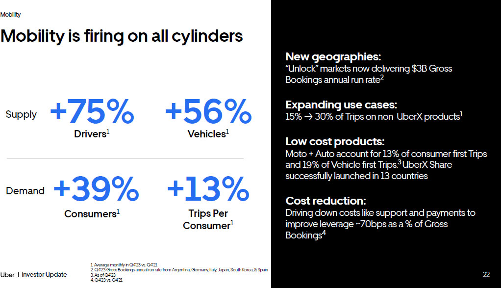 21 Investor Update Mobility ~$70B in Gross Bookings (+ 32% YoY ) ¹ ~$5B in Adjusted EBITDA 2 Global player operating in >70 countries Industry - leading scale, making every journey better $42B $69B $1.5B $5.0B 2018 2019 2020 2021 2022 2023 2018 2019 2020 2021 2022 2023 Adj. EBITDA ($) Adj. EBITDA Margin 3 Growth Profitability Market Leadership 10/10 Category leader in all top 10 countries 1. Growth rate shown on a constant currency basis 2. See Non - GAAP Reconciliations 3. Adjusted EBITDA as a % of Gross Bookings