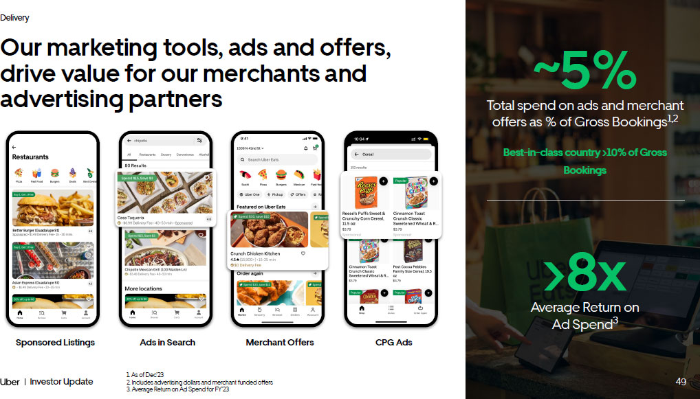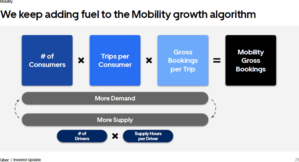 22 Investor Update Mobility New geographies: “Unlock” markets now delivering $3B Gross Bookings annual run rate 2 Expanding use cases: 15% - > 30% of Trips on non - UberX products 1 Low cost products: Moto + Auto account for 13% of consumer first Trips and 19% of Vehicle first Trips. 3 UberX Share successfully launched in 13 countries Cost reduction: Driving down costs like support and payments to improve leverage ~70bps as a % of Gross Bookings 4 Vehicles 1 Mobility is firing on all cylinders +56% +13% Trips Per Consumer 1 +75% Drivers 1 +39% Consumers 1 Supply Demand 1. Average monthly in Q4’23 vs. Q4’21 2. Q4’23 Gross Bookings annual run rate from Argentina, Germany, Italy, Japan, South Korea, & Spain 3. As of Q4’23 4. Q4’23 vs. Q4’21 22