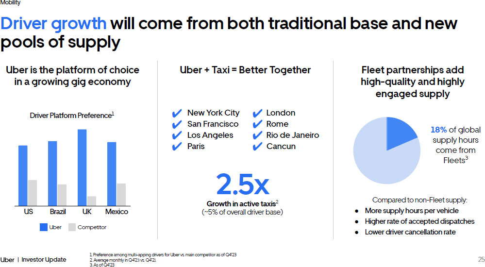 24 Investor Update Mobility Success in Mobility starts with drivers , the engine of growth Local, on - the - ground operational execution has significantly increased our driver base +75% Jan’22 Dec’23 Tech innovation and power of the platform - > structural supply advantage + Upfront fares & destination + Earnings transparency + Multi - gig earning opportunities + Earnings heatmap + Safety features + Reserved Trips + Deactivation Review Center 1. Chart reflects monthly active Mobility drivers