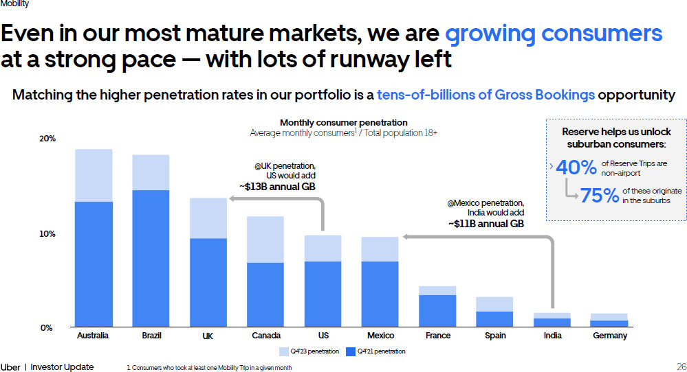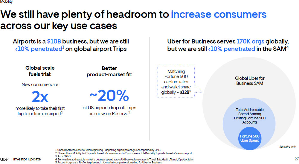 26 Investor Update Mobility 1. Consumers who took at least one Mobility Trip in a given month Even in our most mature markets, we are growing consumers at a strong pace — with lots of runway left Matching the higher penetration rates in our portfolio is a tens - of - billions of Gross Bookings opportunity US Brazil UK Mexico Canada Australia India France Spain Germany Monthly consumer penetration Average monthly consumers 1 / Total population 18+ 20% 10% 0% @Mexico penetration, India would add ~$11B annual GB Q4’23 penetration Q4’21 penetration Reserve helps us unlock suburban consumers: of these originate in the suburbs 40% of Reserve Trips are non - airport 75% @UK penetration, US would add ~ $13B annual GB >