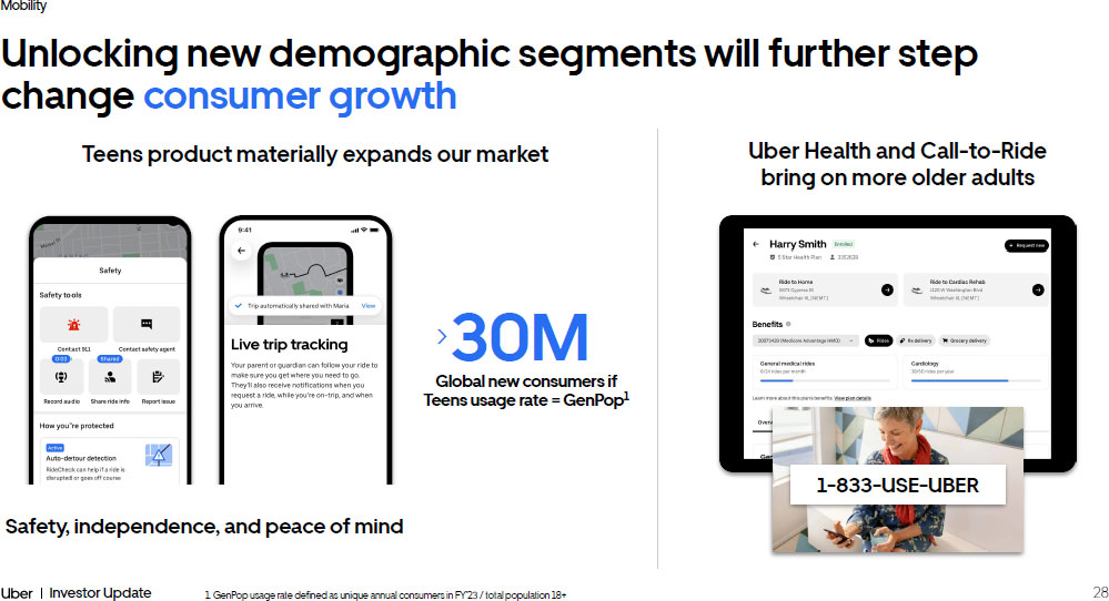 28 Investor Update Mobility Unlocking new demographic segments will further step change consumer growth Teens product materially expands our market 30M > Global new consumers if Teens usage rate = GenPop 1 1. GenPop usage rate defined as unique annual consumers in FY’23 / total population 18+ Safety, independence, and peace of mind Uber Health and Call - to - Ride bring on more older adults 1 - 833 - USE - UBER