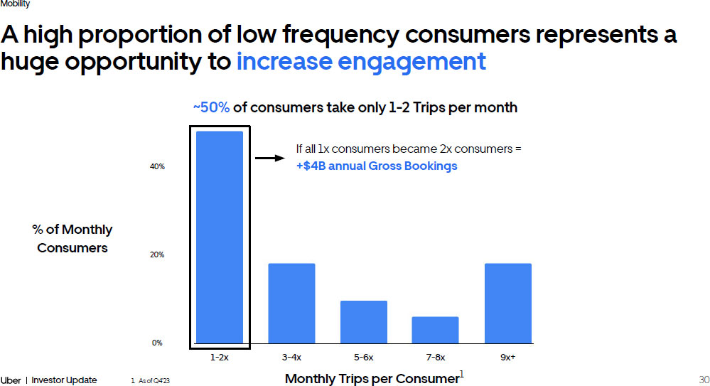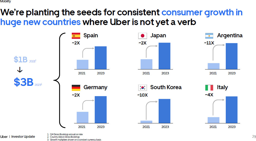 29 Investor Update Mobility Germany We’re planting the seeds for consistent consumer growth in huge new countries where Uber is not yet a verb Italy ~4X South Korea ~10 X ~2X Spain ~2X Japan ~2X ~11 X Argentina 2021 2023 2021 2023 2021 2023 2021 2023 2021 2023 2021 2023 1. Q4 Gross Bookings annual run rate 2. Country data is Gross Bookings 3. Growth multipliers shown on a constant currency basis $1B 2021 1 $3B 2023 1 ↓