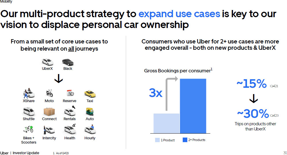 30 Investor Update Mobility A high proportion of low frequency consumers represents a huge opportunity to increase engagement Monthly Trips per Consumer 1 % of Monthly Consumers If all 1x consumers became 2x consumers = +$4B annual Gross Bookings 40% 20% 0% 9x+ 5 - 6x 3 - 4x 1 - 2x 7 - 8x ~50% of consumers take only 1 - 2 Trips per month 1. As of Q4’23