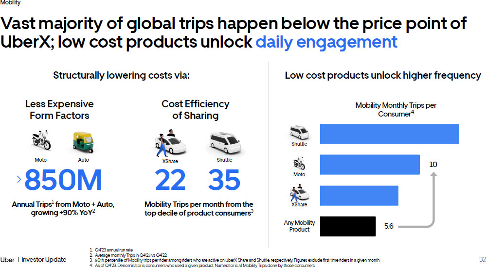 31 Investor Update Mobility ~15% ~30% Our multi - product strategy to expand use cases is key to our vision to displace personal car ownership Gross Bookings per consumer 1 Trips on products other than UberX Consumers who use Uber for 2+ use cases are more engaged overall - both on new products & UberX Q4’2 1 Q4’2 3 From a small set of core use cases to being relevant on all journeys ↓ 1. As of Q4’23 2+ Products 1 Product 3x Black UberX Reserve XShare Moto Shuttle Connect Rentals Intercity Bikes + Scooters Health Hourly Taxi Auto ↓