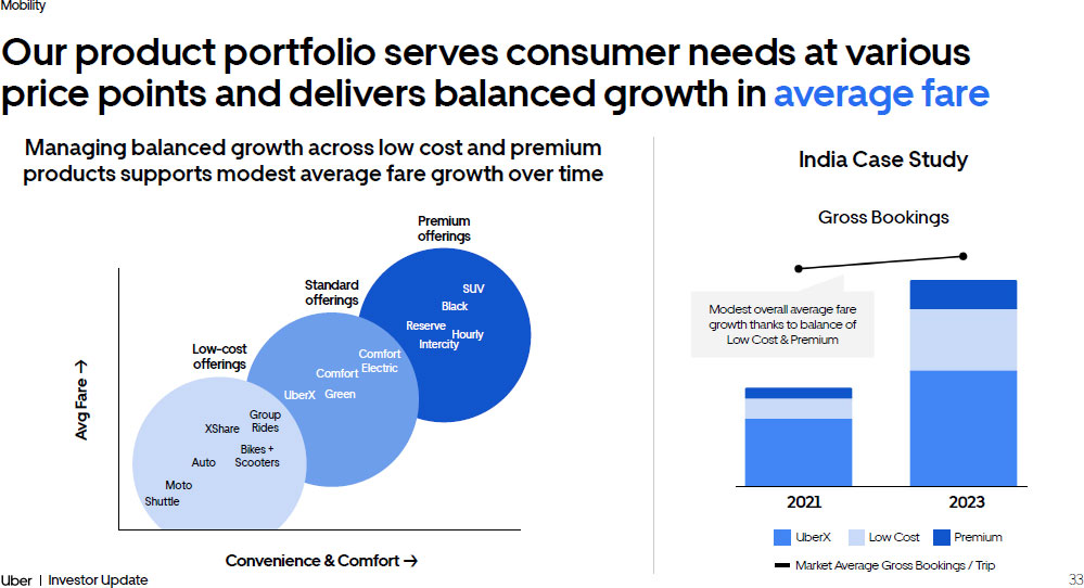 33 Investor Update Mobility Our product portfolio serves consumer needs at various price points and delivers balanced growth in average fare Managing balanced growth across low cost and premium products supports modest average fare growth over time Convenience & Comfort - > Avg Fare - > Moto Low - cost offerings Shuttle Auto Bikes + Scooters XShare Group Rides UberX Comfort Comfort Electric Green Premium offerings Reserve Black SUV Intercity Hourly Standard offerings UberX Low Cost Premium 2021 2023 India Case Study Modest overall average fare growth thanks to balance of Low Cost & Premium Market Average Gross Bookings / Trip Gross Bookings