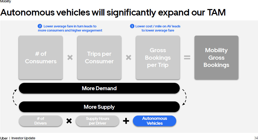 34 Investor Update Mobility Autonomous vehicles will significantly expand our TAM # of Consumers Trips per Consumer Gross Bookings per Trip Mobility Gross Bookings More Demand More Supply # of Drivers Supply Hours per Driver Autonomous Vehicles Lower cost / mile on AV leads to lower average fare Lower average fare in turn leads to more consumers and higher engagement 1 2