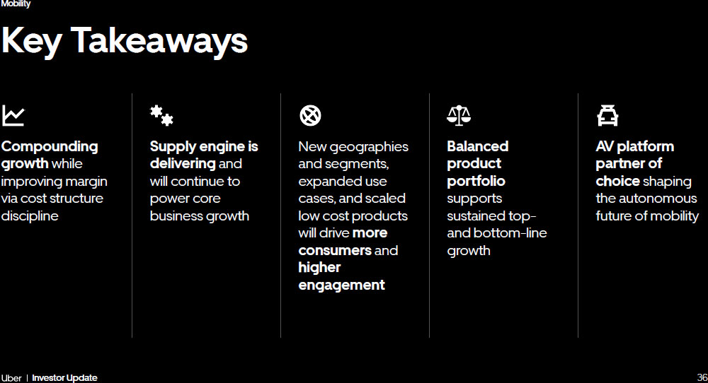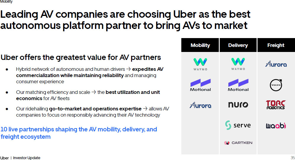35 Investor Update Mobility Uber offers the greatest value for AV partners ● Hybrid network of autonomous and human drivers - > expedites AV commercialization while maintaining reliability and managing consumer experience ● Our matching efficiency and scale - > the best utilization and unit economics for AV fleets ● Our ridehailing go - to - market and operations expertise - > allows AV companies to focus on responsibly advancing their AV technology 10 live partnerships shaping the AV mobility, delivery, and freight ecosystem Leading AV companies are choosing Uber as the best autonomous platform partner to bring AVs to market Delivery Freight Mobility