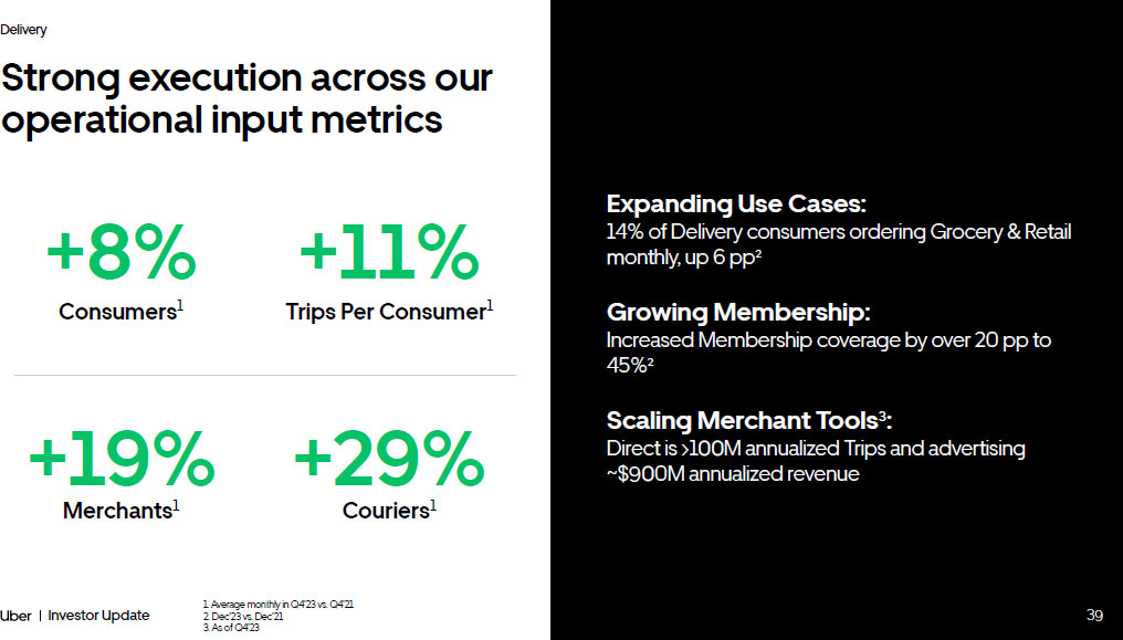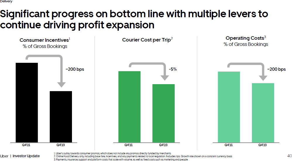 39 Investor Update Delivery +19% Strong execution across our operational input metrics Merchants 1 +11% Trips Per Consumer 1 +8% Consumers 1 +29% Couriers 1 Expanding Use Cases: 14% of Delivery consumers ordering Grocery & Retail monthly, up 6 pp² Growing Membership: Increased Membership coverage by over 20 pp to 45%² Scaling Merchant Tools ³ : Direct is >100M annualized Trips and advertising ~$900M annualized revenue 39 1. Average monthly in Q4’23 vs. Q4’21 2. Dec’23 vs. Dec’21 3. As of Q4’23