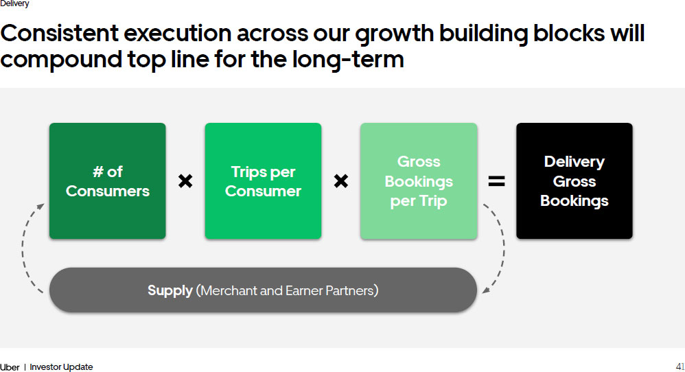 41 Investor Update Delivery Consistent execution across our growth building blocks will compound top line for the long - term Supply (Merchant and Earner Partners) # of Consumers Trips per Consumer Gross Bookings per Trip Delivery Gross Bookings