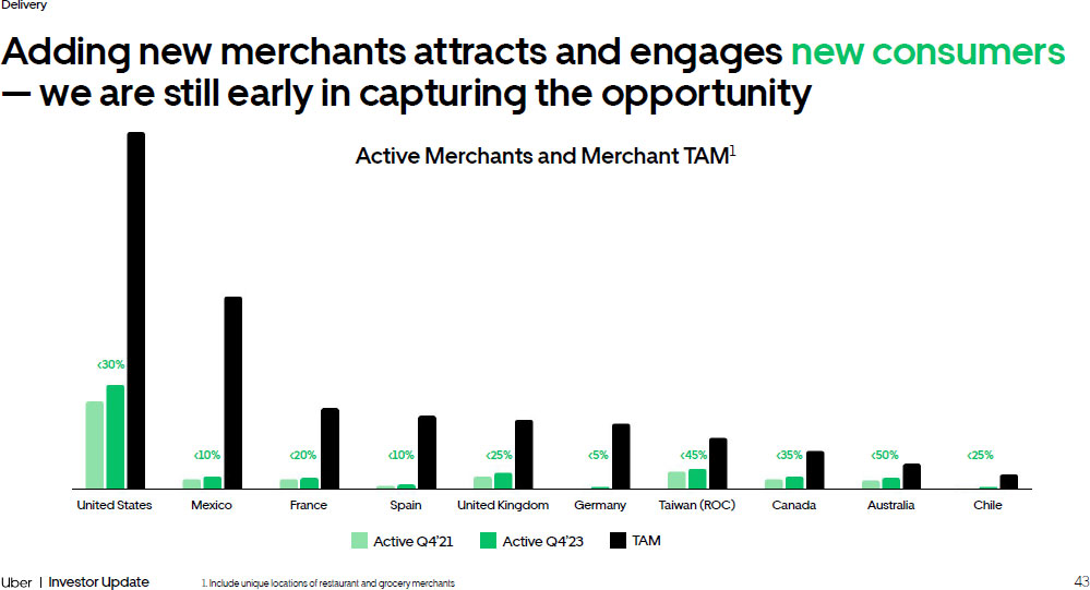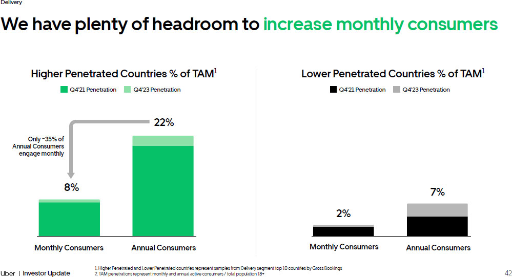 42 Investor Update Delivery We have plenty of headroom to increase monthly consumers 8% 22% 1. Higher Penetrated and Lower Penetrated countries represent samples from Delivery segment top 10 countries by Gross Booking s 2. TAM penetrations represent monthly and annual active consumers / total population 18+ Monthly Consumers Annual Consumers 2% 7% Monthly Consumers Annual Consumers Q4’21 Penetration Q4’23 Penetration Only ~35% of Annual Consumers engage monthly Q4’21 Penetration Q4’23 Penetration