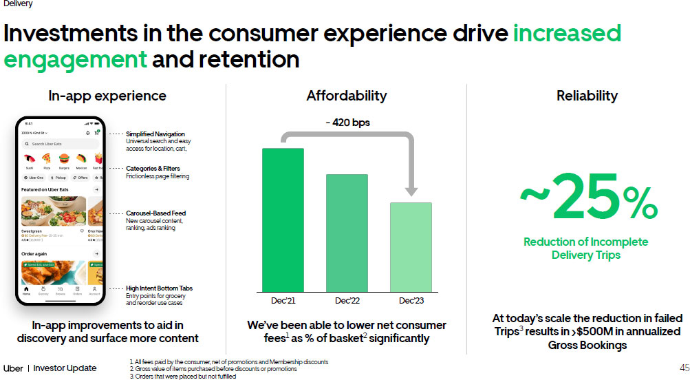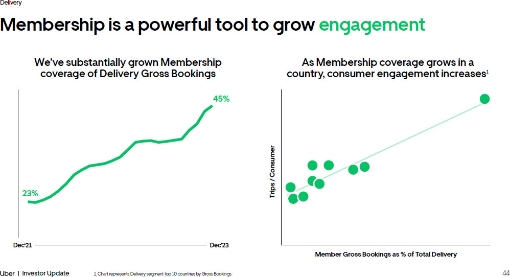 44 Investor Update Delivery Membership is a powerful tool to grow engagement We’ve substantially grown Membership coverage of Delivery Gross Bookings Dec‘21 Dec’23 As Membership coverage grows in a country, consumer engagement increases ¹ Trips / Consumer 1. Chart represents Delivery segment top 10 countries by Gross Bookings Member Gross Bookings as % of Total Delivery 45% 23%