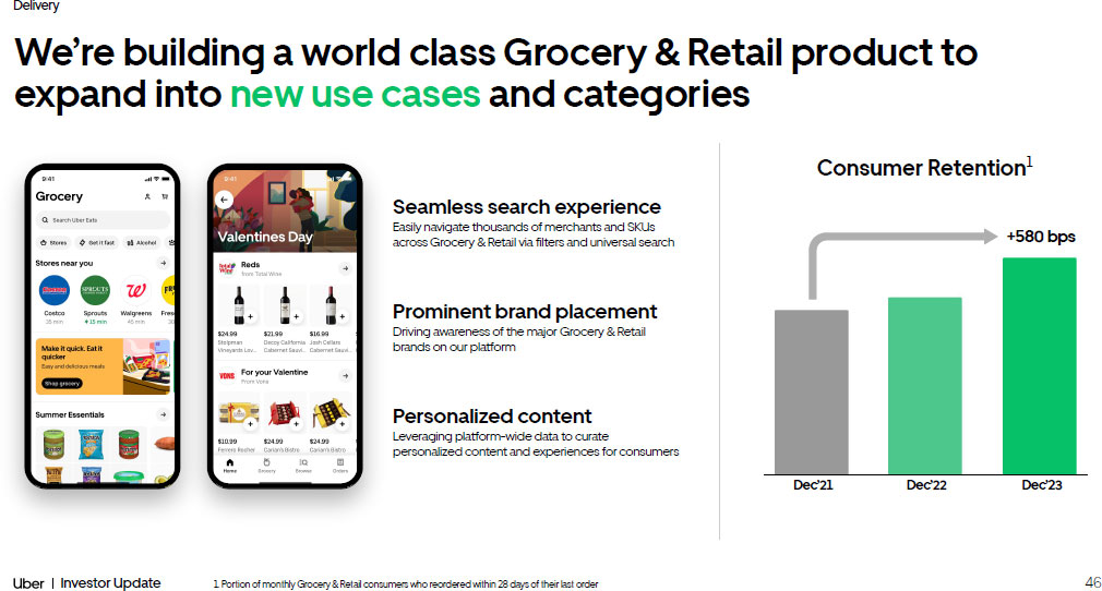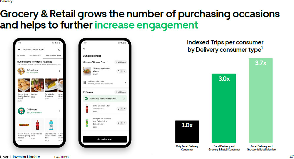 46 Investor Update Delivery We’re building a world class Grocery & Retail product to expand into new use cases and categories 1. Portion of monthly Grocery & Retail consumers who reordered within 28 days of their last order Consumer Retention 1 Dec’22 +580 bps Dec’21 Dec’23 Seamless search experience Easily navigate thousands of merchants and SKUs across Grocery & Retail via filters and universal search Prominent brand placement Driving awareness of the major Grocery & Retail brands on our platform Personalized content Leveraging platform - wide data to curate personalized content and experiences for consumers