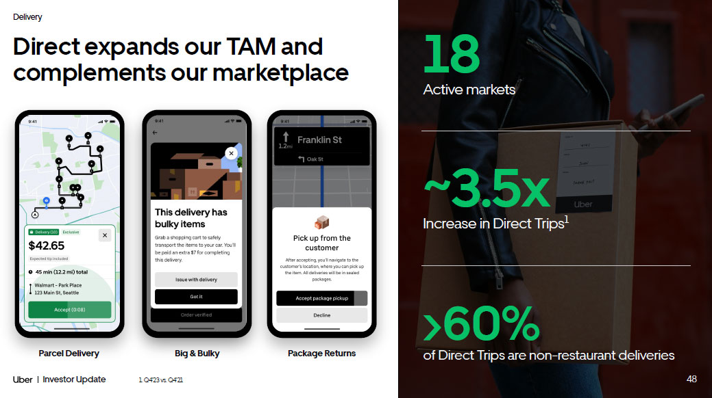 48 Investor Update Delivery Direct expands our TAM and complements our marketplace 48 18 Active markets ~3.5x Increase in Direct Trips 1 >60% of Direct Trips are non - restaurant deliveries Package Returns Parcel Delivery Big & Bulky 1. Q4’23 vs. Q4’21