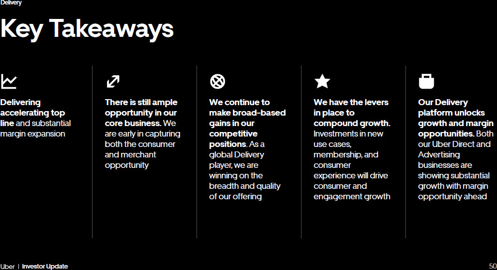 50 Investor Update Delivery Delivering accelerating top line and substantial margin expansion There is still ample opportunity in our core business. We are early in capturing both the consumer and merchant opportunity We continue to make broad - based gains in our competitive positions . As a global Delivery player, we are winning on the breadth and quality of our offering We have the levers in place to compound growth. Investments in new use cases, membership, and consumer experience will drive consumer and engagement growth Key Takeaways Our Delivery platform unlocks growth and margin opportunities. Both our Uber Direct and Advertising businesses are showing substantial growth with margin opportunity ahead