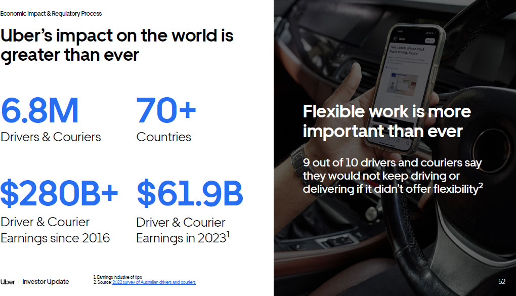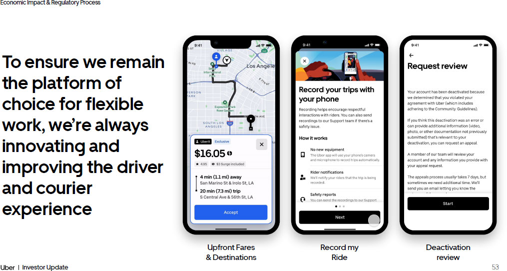52 Investor Update Economic Impact & Regulatory Process Uber’s impact on the world is greater than ever 52 Drivers & Couriers Driver & Courier Earnings since 2016 Countries Driver & Courier Earnings in 2023 1 6.8M 70+ $280B + $61.9B 1. Earnings inclusive of tips 2. Source: 2022 survey of Australian drivers and couriers Flexible work is more important than ever 9 out of 10 drivers and couriers say they would not keep driving or delivering if it didn’t offer flexibility 2