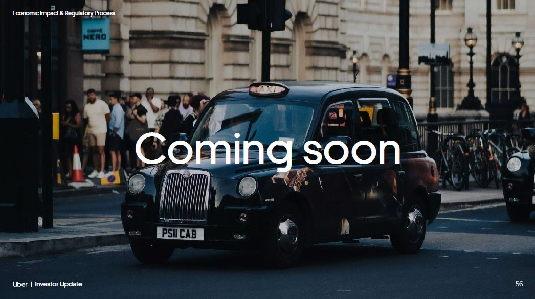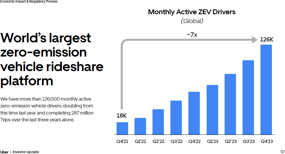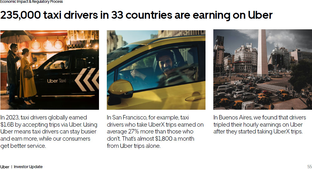 55 Investor Update Economic Impact & Regulatory Process 235,000 taxi drivers in 33 countries are earning on Uber In 2023, taxi drivers globally earned $1.6B by accepting trips via Uber. Using Uber means taxi drivers can stay busier and earn more, while our consumers get better service. In San Francisco, for example, taxi drivers who take UberX trips earned on average 27% more than those who don’t. That’s almost $1,800 a month from Uber trips alone. In Buenos Aires, we found that drivers tripled their hourly earnings on Uber after they started taking UberX trips.