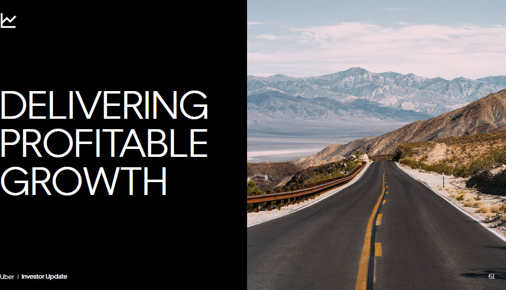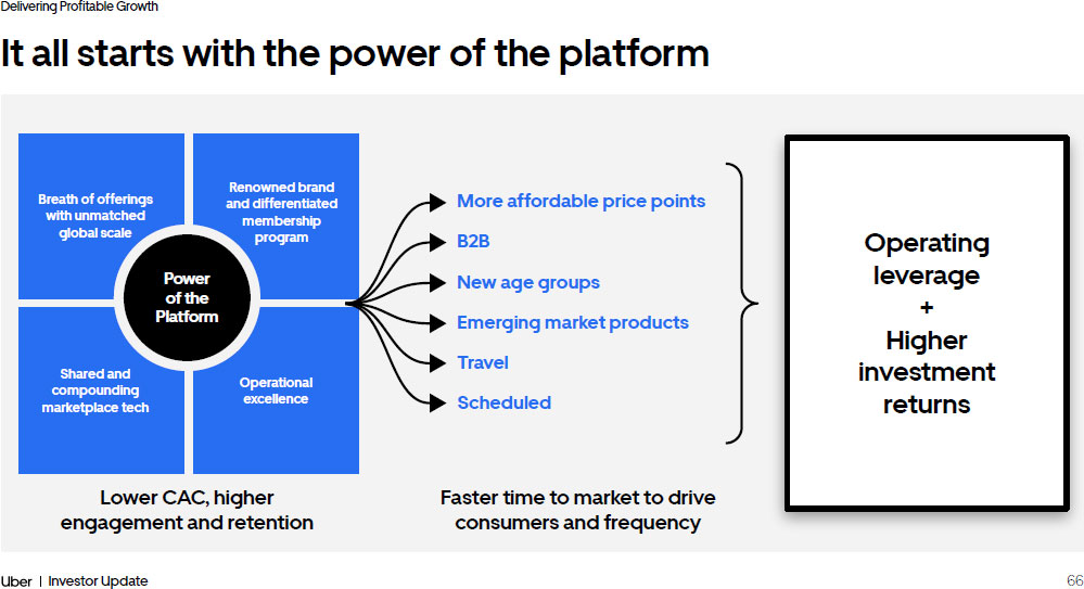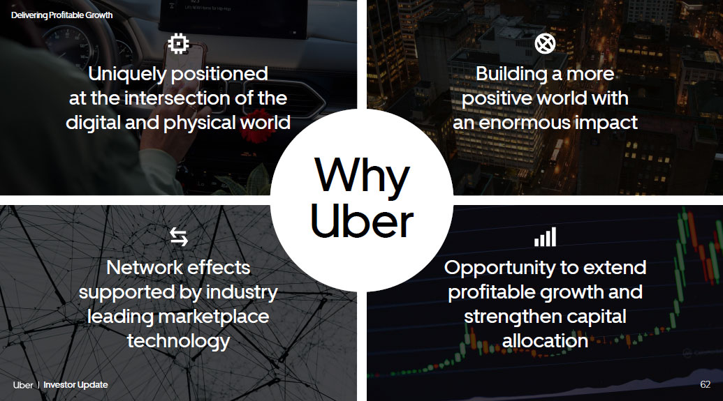 Delivering Profitable Growth 62 Investor Update 62 Opportunity to extend profitable growth and strengthen capital allocation Building a more positive world with an enormous impact Uniquely positioned at the intersection of the digital and physical world Network effects supported by industry leading marketplace technology Why Uber Investor Update Delivering Profitable Growth