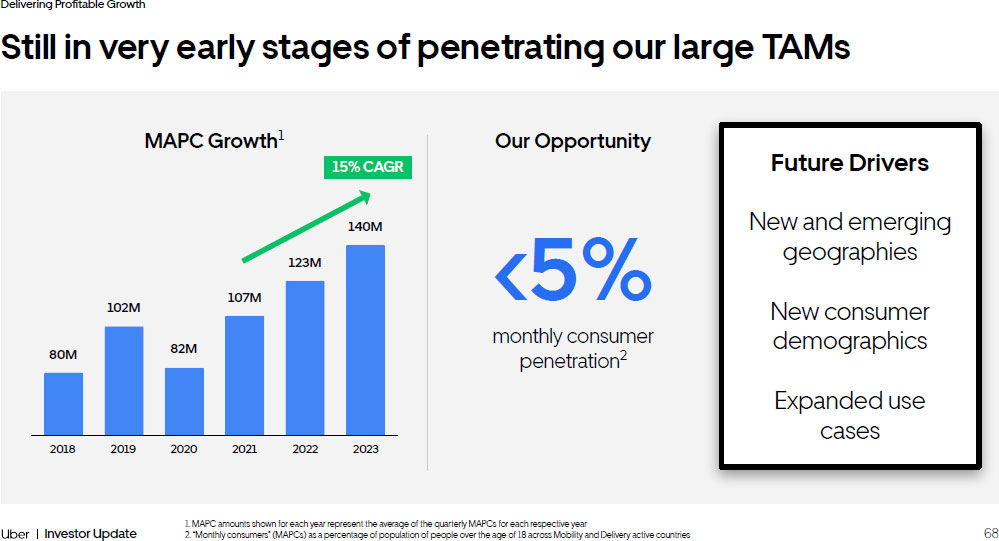 68 Investor Update Delivering Profitable Growth 15% CAGR 80M 2018 2019 2020 2021 2022 2023 102M 82M 107M 123M 140M Still in very early stages of penetrating our large TAMs 1. MAPC amounts shown for each year represent the average of the quarterly MAPCs for each respective year 2. “Monthly consumers” (MAPCs) as a percentage of population of people over the age of 18 across Mobility and Delivery active co untries <5% monthly consumer penetration 2 Future Drivers New and emerging geographies New consumer demographics Expanded use cases MAPC Growth 1 Our Opportunity