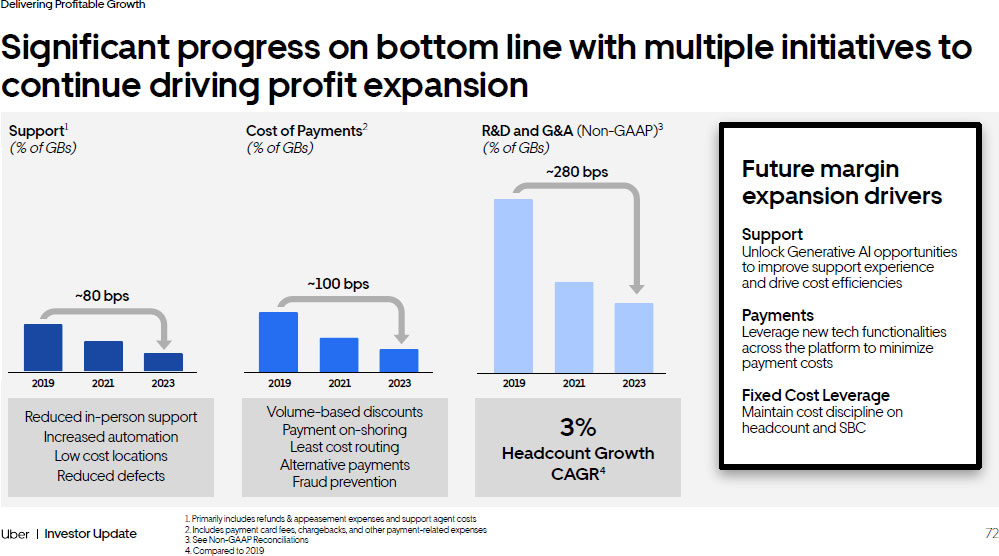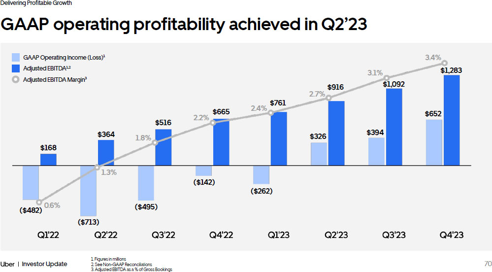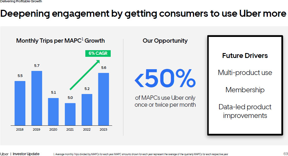 69 Investor Update Delivering Profitable Growth Deepening engagement by getting consumers to use Uber more 1. Average monthly Trips divided by MAPCs for each year. MAPC amounts shown for each year represent the average of the quarte rly MAPCs for each respective year <50% of MAPCs use Uber only once or twice per month 6% CAGR Future Drivers Multi - product use Membership Data - led product improvements Monthly Trips per MAPC 1 Growth Our Opportunity 5.5 2018 2019 2020 2021 2022 2023 5.7 5.1 5.0 5.2 5.6