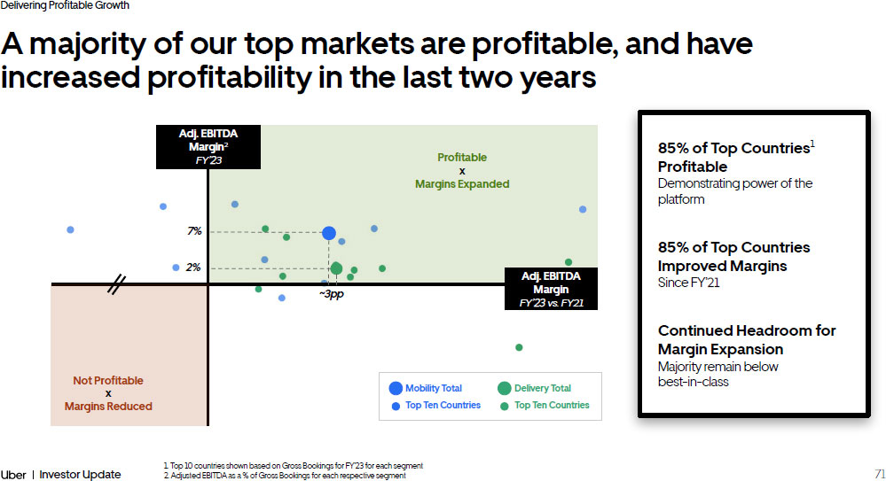 71 Investor Update Delivering Profitable Growth A majority of our top markets are profitable, and have increased profitability in the last two years 1. Top 10 countries shown based on Gross Bookings for FY’23 for each segment 2. Adjusted EBITDA as a % of Gross Bookings for each respective segment 7% ~3pp 2% Not Profitable x Margins Reduced Profitable x Margins Expanded Adj. EBITDA Margin 2 FY’23 Adj. EBITDA Margin FY’23 vs. FY21 Delivery Total Top Ten Countries Mobility Total Top Ten Countries 85% of Top Countries 1 Profitable Demonstrating power of the platform 85% of Top Countries Improved Margins Since FY’21 Continued Headroom for Margin Expansion Majority remain below best - in - class