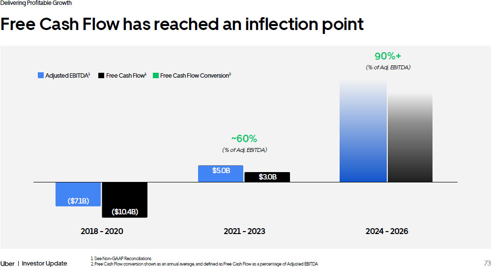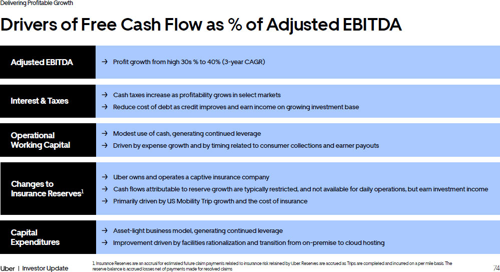 74 Investor Update Delivering Profitable Growth Drivers of Free Cash Flow as % of Adjusted EBITDA 1. Insurance Reserves are an accrual for estimated future claim payments related to insurance risk retained by Uber. Reserves ar e accrued as Trips are completed and incurred on a per mile basis. The reserve balance is accrued losses net of payments made for resolved claims → Uber owns and operates a captive insurance company → Cash flows attributable to reserve growth are typically restricted, and not available for daily operations, but earn investme nt income → Primarily driven by US Mobility Trip growth and the cost of insurance Changes to Insurance Reserves 1 → Profit growth from high 30s % to 40% (3 - year CAGR) Adjusted EBITDA → Cash taxes increase as profitability grows in select markets → Reduce cost of debt as credit improves and earn income on growing investment base Interest & Taxes → Modest use of cash, generating continued leverage → Driven by expense growth and by timing related to consumer collections and earner payouts Operational Working Capital → Asset - light business model, generating continued leverage → Improvement driven by facilities rationalization and transition from on - premise to cloud hosting Capital Expenditures