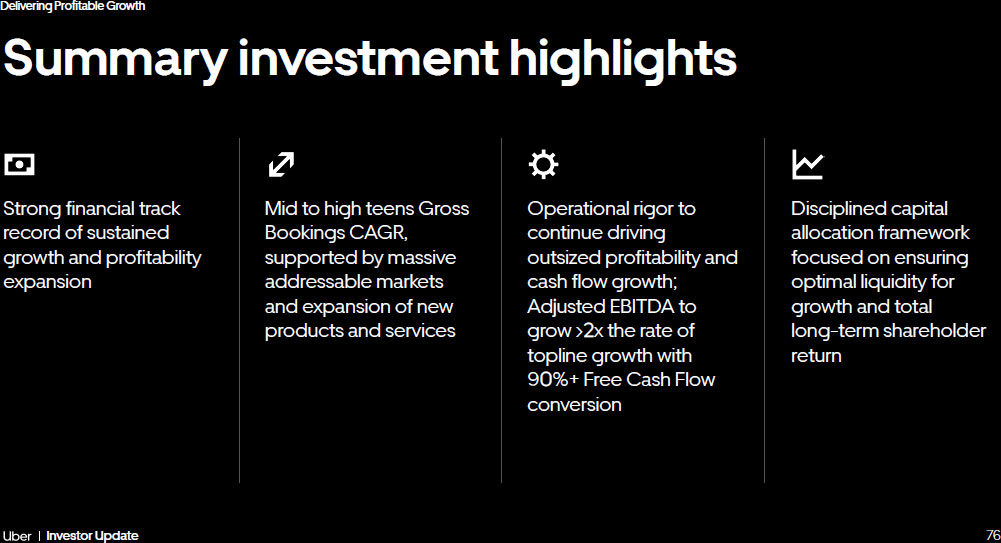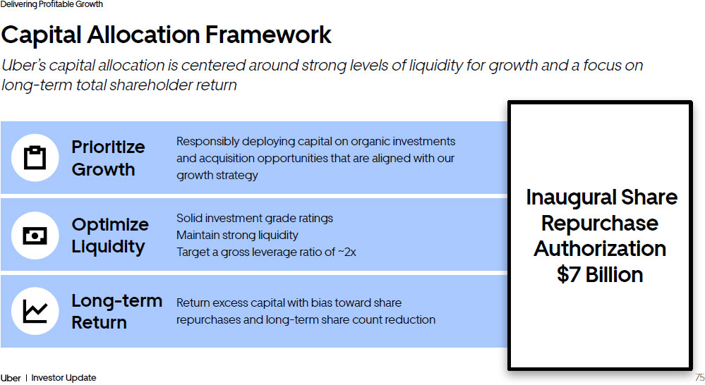 75 Investor Update Delivering Profitable Growth Capital Allocation Framework Uber’s capital allocation is centered around strong levels of liquidity for growth and a focus on long - term total shareholder return Prioritize Growth Responsibly deploying capital on organic investments and acquisition opportunities that are aligned with our growth strategy Optimize Liquidity Solid investment grade ratings Maintain strong liquidity Target a gross leverage ratio of ~2x Long - term Return Return excess capital with bias toward share repurchases and long - term share count reduction Inaugural Share Repurchase Authorization $7 Billion