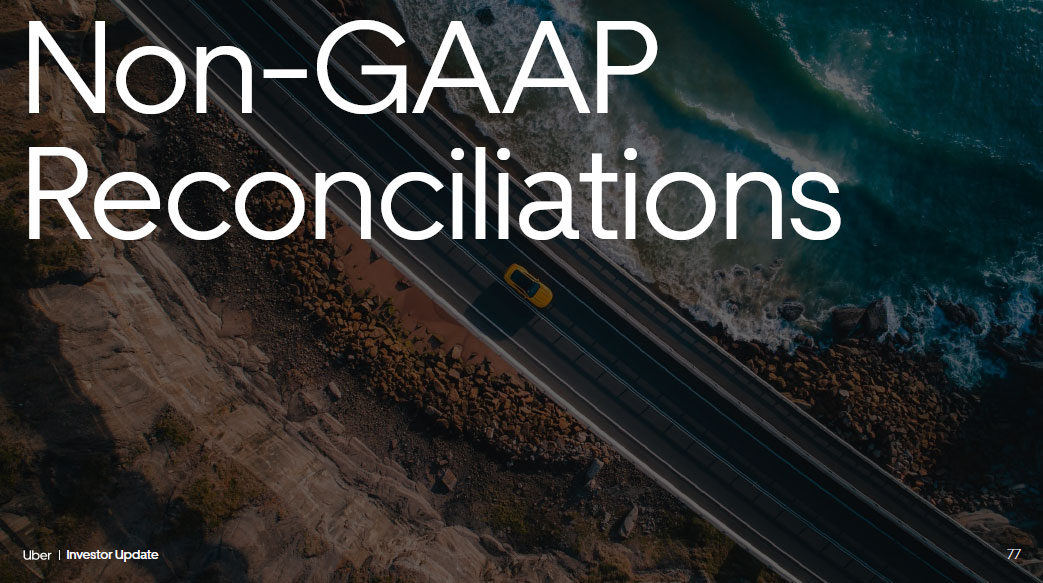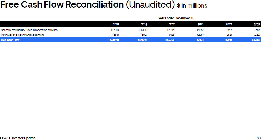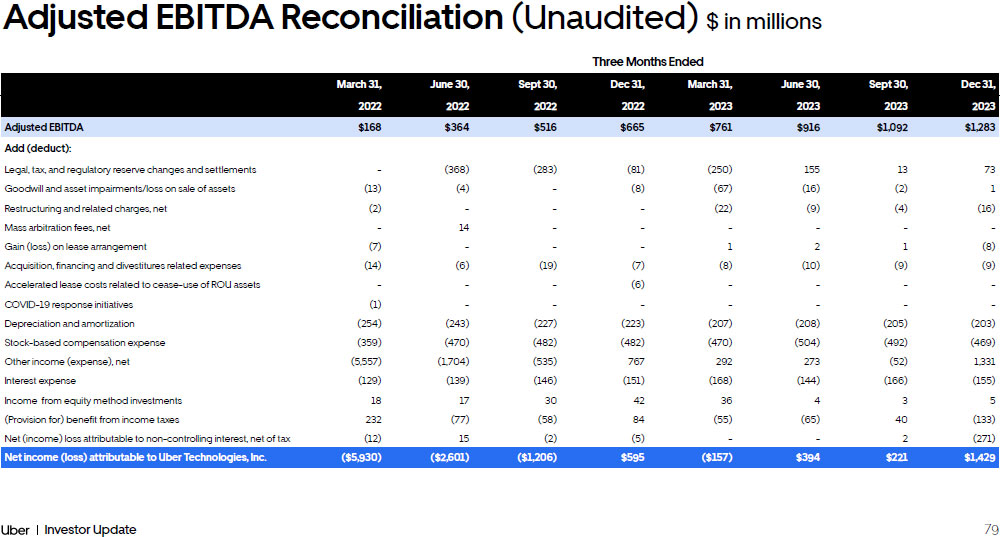 79 Investor Update Financial Framework Three Months Ended March 31, June 30, Sept 30, Dec 31, March 31, June 30, Sept 30, Dec 31, 2022 2022 2022 2022 2023 2023 2023 2023 Adjusted EBITDA $168 $364 $516 $665 $761 $916 $1,092 $1,283 Add (deduct): Legal, tax, and regulatory reserve changes and settlements - (368) (283) (81) (250) 155 13 73 Goodwill and asset impairments/loss on sale of assets (13) (4) - (8) (67) (16) (2) 1 Restructuring and related charges, net (2) - - - (22) (9) (4) (16) Mass arbitration fees, net - 14 - - - - - - Gain (loss) on lease arrangement (7) - - - 1 2 1 (8) Acquisition, financing and divestitures related expenses (14) (6) (19) (7) (8) (10) (9) (9) Accelerated lease costs related to cease - use of ROU assets - - - (6) - - - - COVID - 19 response initiatives (1) - - - - - - - Depreciation and amortization (254) (243) (227) (223) (207) (208) (205) (203) Stock - based compensation expense (359) (470) (482) (482) (470) (504) (492) (469) Other income (expense), net (5,557) (1,704) (535) 767 292 273 (52) 1,331 Interest expense (129) (139) (146) (151) (168) (144) (166) (155) Income from equity method investments 18 17 30 42 36 4 3 5 (Provision for) benefit from income taxes 232 (77) (58) 84 (55) (65) 40 (133) Net (income) loss attributable to non - controlling interest, net of tax (12) 15 (2) (5) - - 2 (271) Net income (loss) attributable to Uber Technologies, Inc. ($5,930) ($2,601) ($1,206) $595 ($157) $394 $221 $1,429 Adjusted EBITDA Reconciliation (Unaudited) $ in millions