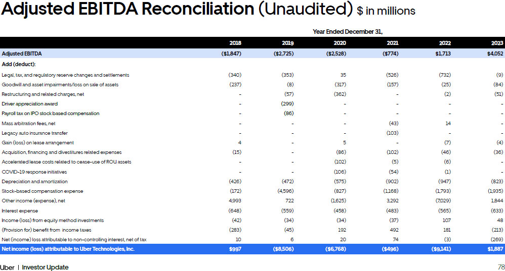 78 Investor Update Adjusted EBITDA Reconciliation (Unaudited) $ in millions Year Ended December 31, 2018 2019 2020 2021 2022 2023 Adjusted EBITDA ($1,847) ($2,725) ($2,528) ($774) $1,713 $4,052 Add (deduct): Legal, tax, and regulatory reserve changes and settlements (340) (353) 35 (526) (732) (9) Goodwill and asset impairments/loss on sale of assets (237) (8) (317) (157) (25) (84) Restructuring and related charges, net - (57) (362) - (2) (51) Driver appreciation award - (299) - - - - Payroll tax on IPO stock based compensation - (86) - - - - Mass arbitration fees, net - - - (43) 14 - Legacy auto insurance transfer - - - (103) - - Gain (loss) on lease arrangement 4 - 5 - (7) (4) Acquisition, financing and divestitures related expenses (15) - (86) (102) (46) (36) Accelerated lease costs related to cease - use of ROU assets - - (102) (5) (6) - COVID - 19 response initiatives - - (106) (54) (1) - Depreciation and amortization (426) (472) (575) (902) (947) (823) Stock - based compensation expense (172) (4,596) (827) (1,168) (1,793) (1,935) Other income (expense), net 4,993 722 (1,625) 3,292 (7,029) 1,844 Interest expense (648) (559) (458) (483) (565) (633) Income (loss) from equity method investments (42) (34) (34) (37) 107 48 (Provision for) benefit from income taxes (283) (45) 192 492 181 (213) Net (income) loss attributable to non - controlling interest, net of tax 10 6 20 74 (3) (269) Net income (loss) attributable to Uber Technologies, Inc. $997 ($8,506) ($6,768) ($496) ($9,141) $1,887