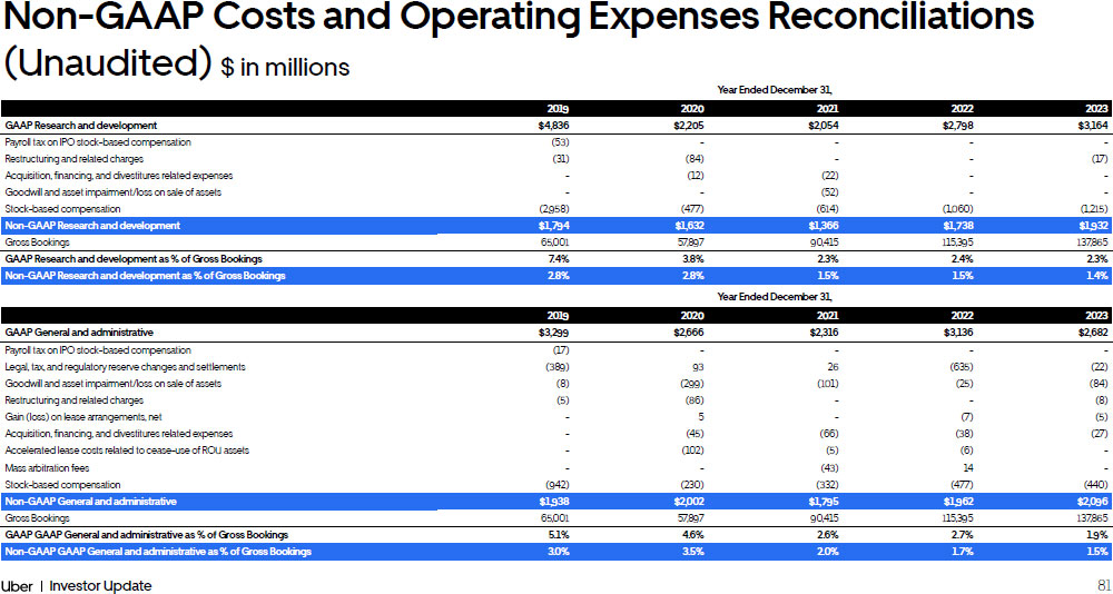 81 Investor Update Financial Framework Year Ended December 31, 2019 2020 2021 2022 2023 GAAP Research and development $4,836 $2,205 $2,054 $2,798 $3,164 Payroll tax on IPO stock - based compensation (53) - - - - Restructuring and related charges (31) (84) - - (17) Acquisition, financing, and divestitures related expenses - (12) (22) - - Goodwill and asset impairment/loss on sale of assets - - (52) - - Stock - based compensation (2,958) (477) (614) (1,060) (1,215) Non - GAAP Research and development $1,794 $1,632 $1,366 $1,738 $1,932 Gross Bookings 65,001 57,897 90,415 115,395 137,865 GAAP Research and development as % of Gross Bookings 7.4% 3.8% 2.3% 2.4% 2.3% Non - GAAP Research and development as % of Gross Bookings 2.8% 2.8% 1.5% 1.5% 1.4% Non - GAAP Costs and Operating Expenses Reconciliations (Unaudited) $ in millions Year Ended December 31, 2019 2020 2021 2022 2023 GAAP General and administrative $3,299 $2,666 $2,316 $3,136 $2,682 Payroll tax on IPO stock - based compensation (17) - - - - Legal, tax, and regulatory reserve changes and settlements (389) 93 26 (635) (22) Goodwill and asset impairment/loss on sale of assets (8) (299) (101) (25) (84) Restructuring and related charges (5) (86) - - (8) Gain (loss) on lease arrangements, net - 5 - (7) (5) Acquisition, financing, and divestitures related expenses - (45) (66) (38) (27) Accelerated lease costs related to cease - use of ROU assets - (102) (5) (6) - Mass arbitration fees - - (43) 14 - Stock - based compensation (942) (230) (332) (477) (440) Non - GAAP General and administrative $1,938 $2,002 $1,795 $1,962 $2,096 Gross Bookings 65,001 57,897 90,415 115,395 137,865 GAAP GAAP General and administrative as % of Gross Bookings 5.1% 4.6% 2.6% 2.7% 1.9% Non - GAAP GAAP General and administrative as % of Gross Bookings 3.0% 3.5% 2.0% 1.7% 1.5%