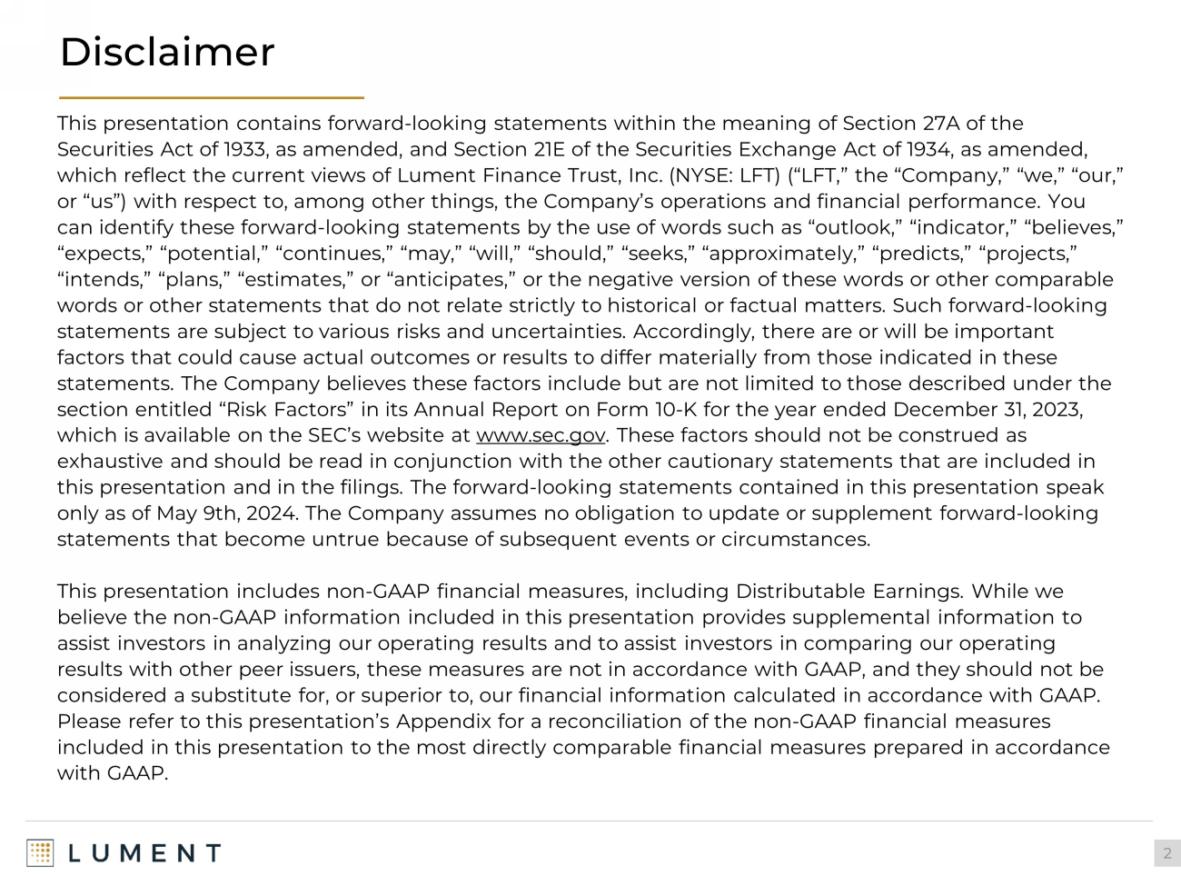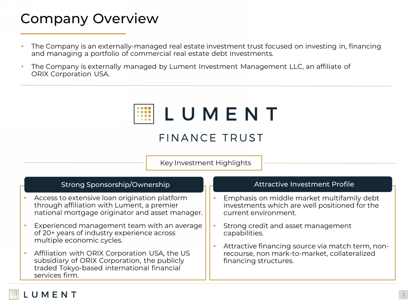 Disclaimer 2 This presentation contains forward - looking statements within the meaning of Section 27A of the Securities Act of 1933, as amended, and Section 21E of the Securities Exchange Act of 1934, as amended, which reflect the current views of Lument Finance Trust, Inc. (NYSE: LFT) (“LFT,” the “Company,” “we,” “our,” or “us”) with respect to, among other things, the Company’s operations and financial performance. You can identify these forward - looking statements by the use of words such as “outlook,” “indicator,” “believes,” “expects,” “potential,” “continues,” “may,” “will,” “should,” “seeks,” “approximately,” “predicts,” “projects,” “intends,” “plans,” “estimates,” or “anticipates,” or the negative version of these words or other comparable words or other statements that do not relate strictly to historical or factual matters. Such forward - looking statements are subject to various risks and uncertainties. Accordingly, there are or will be important factors that could cause actual outcomes or results to differ materially from those indicated in these statements. The Company believes these factors include but are not limited to those described under the section entitled “Risk Factors” in its Annual Report on Form 10 - K for the year ended December 31, 2023, which is available on the SEC’s website at www.sec.gov . These factors should not be construed as exhaustive and should be read in conjunction with the other cautionary statements that are included in this presentation and in the filings. The forward - looking statements contained in this presentation speak only as of May 9th, 2024. The Company assumes no obligation to update or supplement forward-looking statements that become untrue because of subsequent events or circumstances. This presentation includes non - GAAP financial measures, including Distributable Earnings. While we believe the non - GAAP information included in this presentation provides supplemental information to assist investors in analyzing our operating results and to assist investors in comparing our operating results with other peer issuers, these measures are not in accordance with GAAP, and they should not be considered a substitute for, or superior to, our financial information calculated in accordance with GAAP. Please refer to this presentation’s Appendix for a reconciliation of the non - GAAP financial measures included in this presentation to the most directly comparable financial measures prepared in accordance with GAAP.