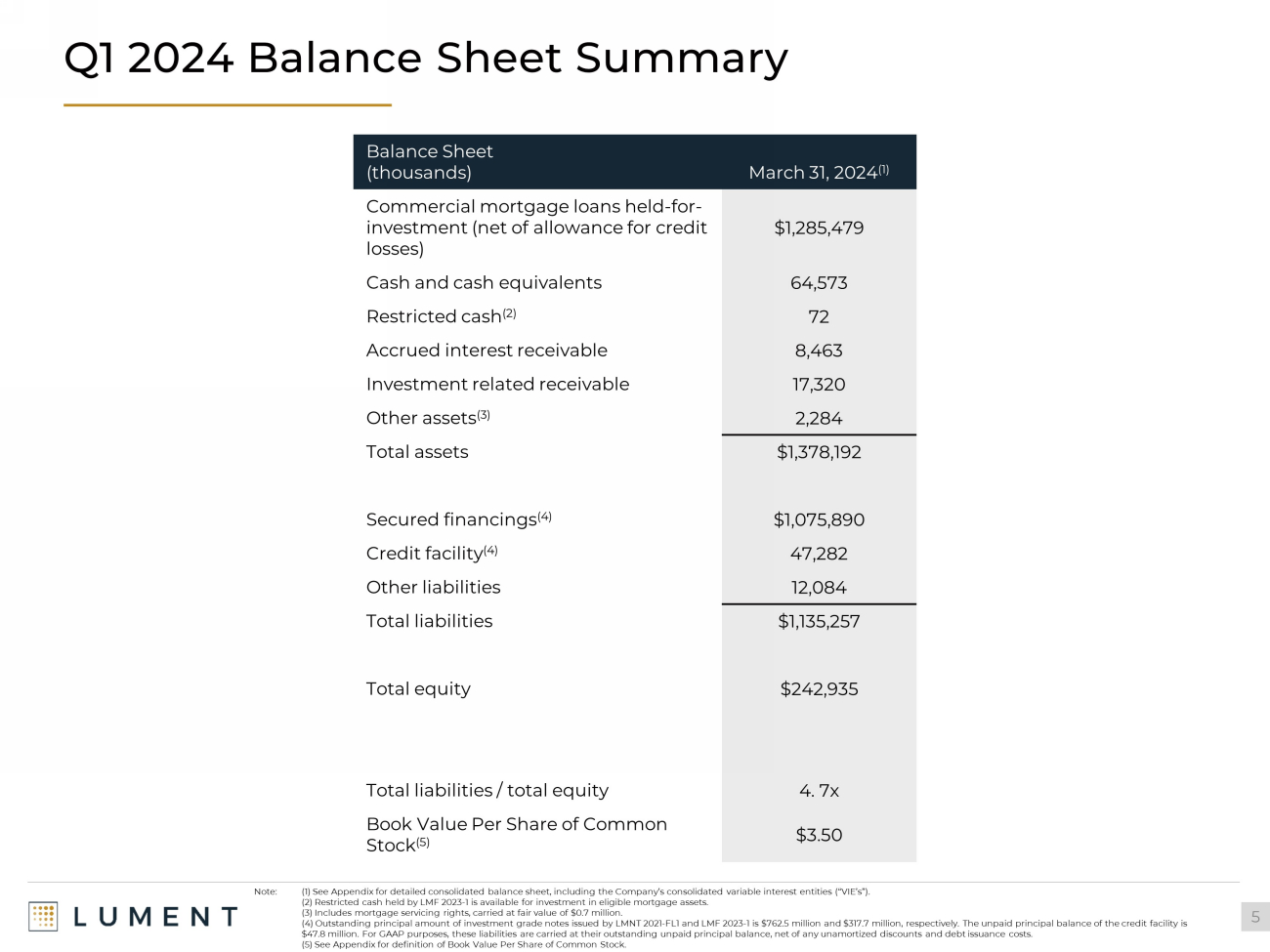 Q1 2024 Updates 4 Note: (1) We believe that Distributable Earnings provides meaningful information to consider in addition to our net income (los s) and cash flows from operating activities determined in accordance with GAAP. Distributable Earnings mirrors how we calculated Core Earnings in the past. Please see Appendix for reconciliation to GAAP. (2) See Appendix for definition of Book Value Per Share of Common Stock. (3) Based on carrying value. (4) If all extensions are exercised by the borrowers, the CRE loan portfolio will have a weighted average remaining term of 3 3 months. Financial Results • Q1 2024 GAAP net income attributable to common stockholders of $0.11 per share of common stock. • Q1 2024 Distributable Earnings (1) of $0.15 per share of common stock. • On March 15, 2024, the Company declared a cash dividend for the quarter of $0.07 per share of common stock. • The Company also declared a cash dividend for the quarter of $0.49219 per share of 7.875% Cumulative Redeemable Series A Preferred Stock. • Q1 2024 Book Value Per Share of Common Stock of $3.50 (2) . Notable Activity • During the quarter, the Company experienced $97.4 million of loan payoffs. Portfolio Performance • As of March 31, 2024, the Company’s investment portfolio consisted of floating - rate CRE loans of which approximately 93.6% (3) were collateralized by multifamily assets. • As of March 31, 2024, the Company’s $1.3 billion loan portfolio had a weighted average remaining term of 11 months (4) , a weighted average interest rate of SOFR + 3.60%, and unamortized purchase discounts of $6.3 million. • The weighted average risk rating of the portfolio remained unchanged from the prior quarter at 3.5, with 76.9% of the portfolio rated “3” (Moderate Risk) or better. • No asset - specific reserves were recorded during the period. Capitalization • The floating - rate CRE loan portfolio is financed primarily through the Company’s two outstanding non - mark - to - market secured financings: • $762.5 million of investment grade notes issued through LMNT 2021 - FL1. • $317.7 million of investment grade notes issued through LMF 2023 - 1. • As of March 31, 2024, the Company held cash and cash equivalents of $64.6 million with a leverage ratio of 4.7x, a decrease of 0.3x from 5.0x in the prior quarter. • No corporate debt maturities until 2026.