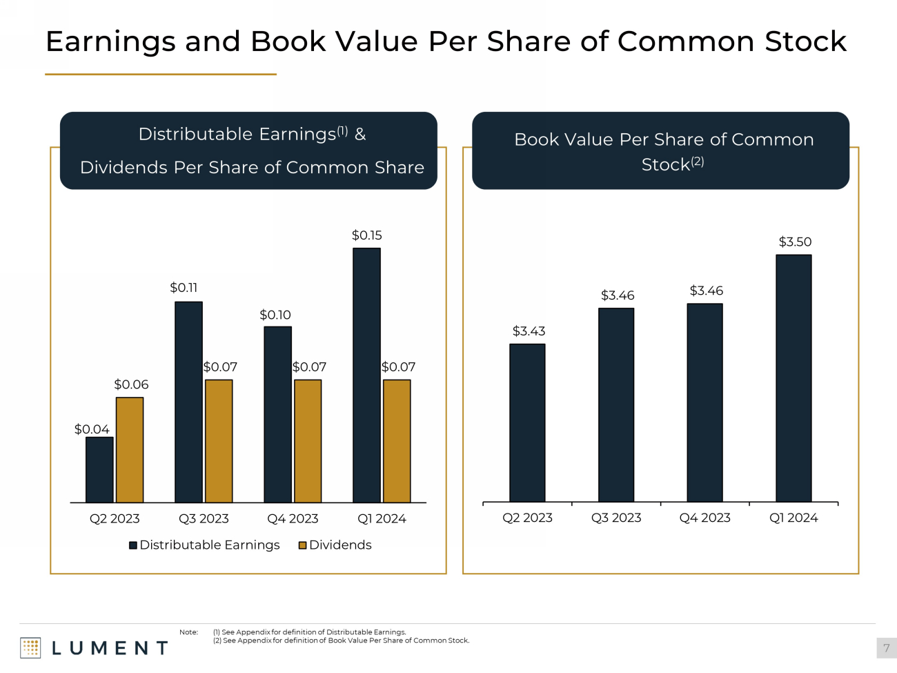 Q1 2024 Income Statement Summary 6 Summary Income Statement (thousands) Three Months Ended March 31, 2024 Net interest income $12,993 Total other income (loss) (1,734) Operating expenses (4,268) Benefit (provision) from income taxes (11) Preferred dividends (1,185) Net income attributable to common stockholders $5,795 Weighted average shares outstanding during the period, basic and diluted 52,249,299 Net income attributable to common stockholders per share $0.11 GAAP Net Income to Distributable Earnings Reconciliation (thousands) Three Months Ended March 31, 2024 Net Income attributable to common stockholders $5,795 Adjustments: Unrealized (gains) losses on mortgage servicing rights (5) Unrealized provision for credit losses 1,777 Provision for (benefit from) income taxes 11 Distributable Earnings (1) $7,578 Weighted average shares outstanding during the period, basic and diluted 52,249,299 Distributable Earnings per share of common stock $0.15 Dividend per share of common stock $0.07 Note: (1) See Appendix for definition of Distributable Earnings and reconciliation to GAAP.