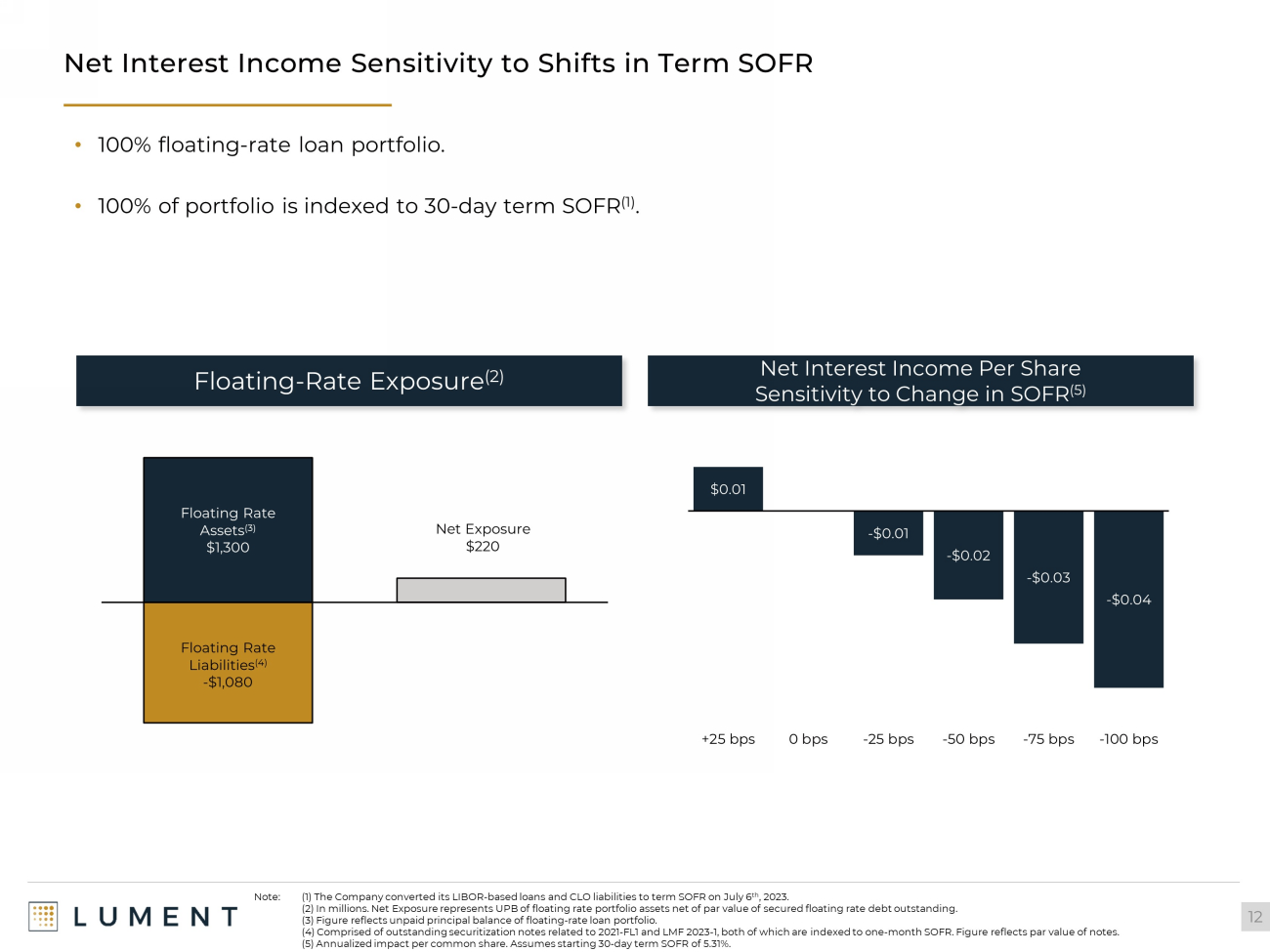 $0.01 - $0.01 - $0.02 - $0.03 - $0.04 +25 bps 0 bps -25 bps -50 bps -75 bps -100 bps Net Interest Income Sensitivity to Shifts in Term SOFR 12 Floating Rate Assets (3) $1,300 Floating Rate Liabilities (4) - $1,080 Net Exposure $220 Floating - Rate Exposure (2) Net Interest Income Per Share Sensitivity to Change in SOFR (5) Note: (1) The Company converted its LIBOR - based loans and CLO liabilities to term SOFR on July 6 th , 2023. (2) In millions. Net Exposure represents UPB of floating rate portfolio assets net of par value of secured floating rate debt o utstanding. (3) Figure reflects unpaid principal balance of floating - rate loan portfolio. (4) Comprised of outstanding securitization notes related to 2021 - FL1 and LMF 2023 - 1, both of which are indexed to one - month SO FR. Figure reflects par value of notes. (5) Annualized impact per common share. Assumes starting 30 - day term SOFR of 5.31%. • 100% floating - rate loan portfolio. • 100% of portfolio is indexed to 30 - day term SOFR (1) .
