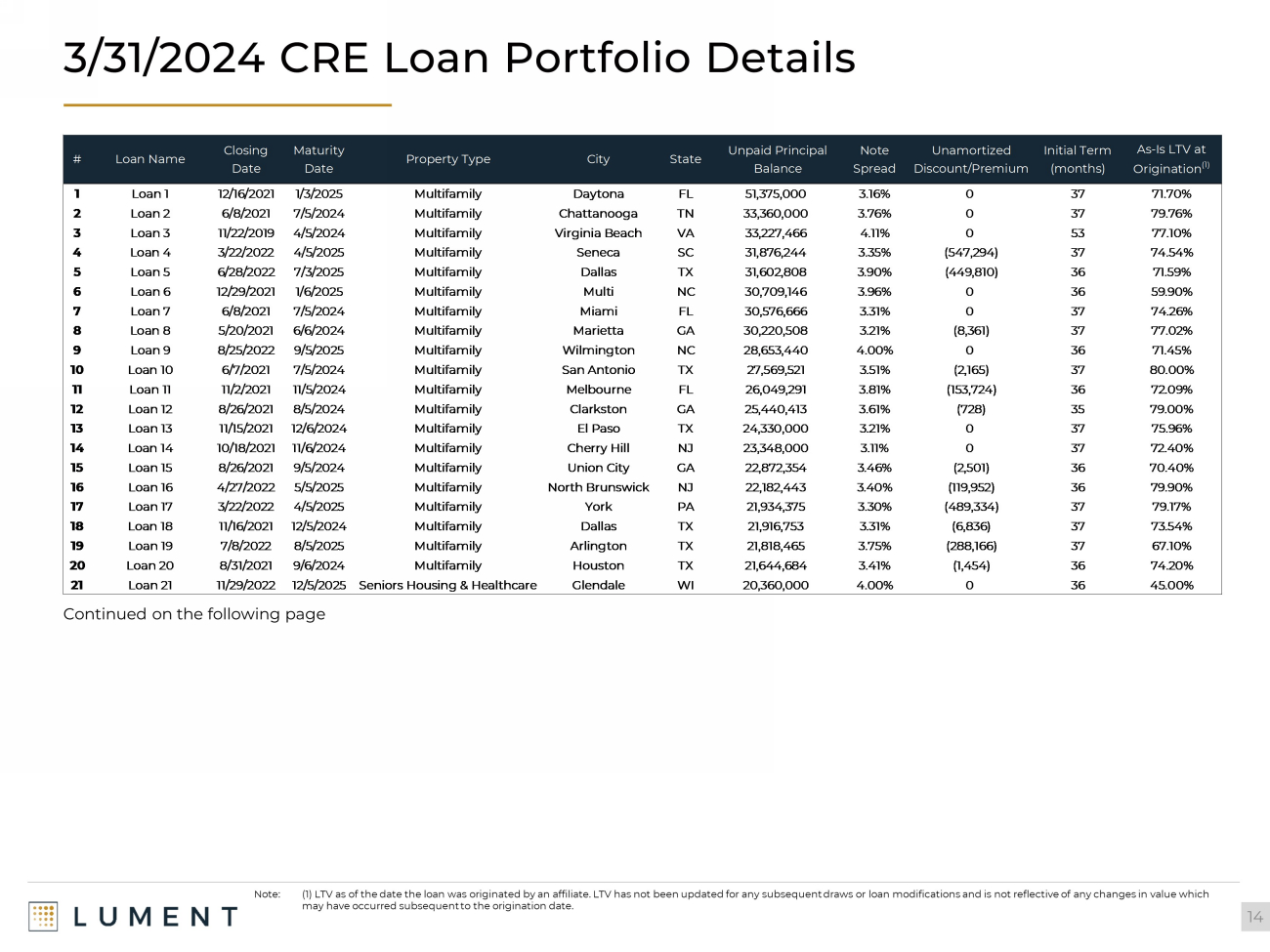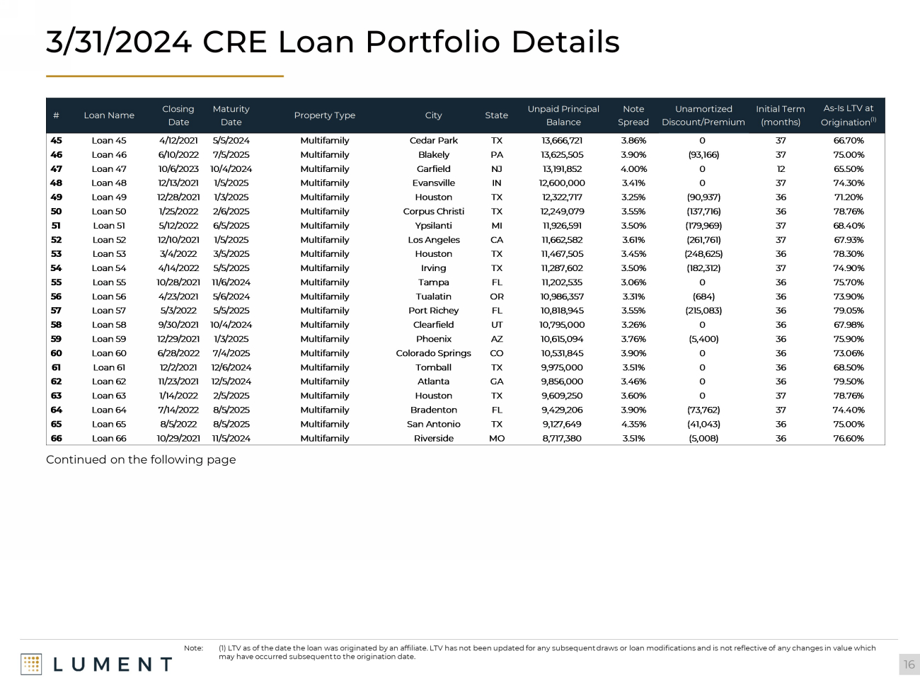 3/31/2024 CRE Loan Portfolio Details 15 Continued on the following page Note: (1) LTV as of the date the loan was originated by an affiliate. LTV has not been updated for any subsequent draws or loan modifications and is not reflective of any changes in value which may have occurred subsequent to the origination date. # Loan Name Closing Date Maturity Date Property Type City State Unpaid Principal Balance Note Spread Unamortized Discount/Premium Initial Term (months) As-Is LTV at Origination (1) 22 Loan 22 6/10/2022 7/5/2025 Multifamily Various GA 20,250,372 3.75% (293,429) 37 75.79% 23 Loan 23 11/5/2021 11/5/2024 Multifamily Orlando FL 19,625,274 3.11% (3,944) 36 78.05% 24 Loan 24 4/13/2022 5/5/2025 Multifamily Decatur GA 18,989,494 3.55% (305,685) 37 75.70% 25 Loan 25 11/21/2022 12/5/2025 Seniors Housing & Healthcare Houston TX 18,920,000 4.00% 0 37 67.00% 26 Loan 26 11/23/2021 12/5/2024 Multifamily Orange NJ 18,834,024 3.31% (4,062) 36 78.00% 27 Loan 27 2/2/2022 2/6/2025 Multifamily Houston TX 18,660,822 3.50% (115,127) 36 77.50% 28 Loan 28 2/11/2022 3/5/2025 Multifamily Tampa FL 18,599,480 3.60% 0 37 77.99% 29 Loan 29 5/26/2022 6/6/2024 Multifamily Brooklyn NY 17,263,000 3.75% 0 24 64.30% 30 Loan 30 3/31/2022 4/5/2025 Multifamily Tallahassee FL 16,956,276 3.30% (341,568) 36 74.80% 31 Loan 31 11/10/2022 12/5/2025 Seniors Housing & Healthcare Austin TX 16,690,000 4.00% 0 37 65.00% 32 Loan 32 12/1/2021 12/5/2024 Multifamily Horn Lake MS 15,449,323 3.41% (11,673) 36 75.70% 33 Loan 33 2/1/2022 2/5/2025 Multifamily San Antonio TX 15,400,000 3.45% 0 36 79.79% 34 Loan 34 4/6/2022 4/4/2025 Multifamily Vineland NJ 15,347,180 3.75% (231,868) 36 77.00% 35 Loan 35 4/6/2022 4/5/2025 Multifamily Haltom City TX 15,156,425 3.45% (235,915) 36 74.10% 36 Loan 36 12/2/2021 12/6/2024 Multifamily Colorado Springs CO 15,010,343 3.11% 0 36 72.48% 37 Loan 37 2/22/2022 3/5/2025 Multifamily Philadelphia PA 15,000,000 3.80% 0 36 80.00% 38 Loan 38 6/15/2022 7/5/2025 Multifamily Denton TX 14,511,455 3.90% (8,425) 37 73.00% 39 Loan 39 7/26/2022 8/5/2025 Multifamily Atlanta GA 14,351,599 3.65% (253,084) 36 65.15% 40 Loan 40 4/27/2022 5/5/2025 Multifamily Houston TX 14,171,704 3.70% (209,847) 36 79.60% 41 Loan 41 1/13/2022 2/5/2025 Multifamily Indianapolis IN 14,119,842 3.75% (148,918) 37 80.00% 42 Loan 42 11/21/2022 12/5/2025 Seniors Housing & Healthcare Southlake TX 14,030,000 4.00% 0 37 48.00% 43 Loan 43 12/28/2021 1/3/2025 Multifamily Houston TX 14,000,000 3.25% (199,045) 36 71.22% 44 Loan 44 5/13/2022 6/5/2025 Multifamily Decatur AL 13,885,769 3.50% (111,969) 37 59.21%