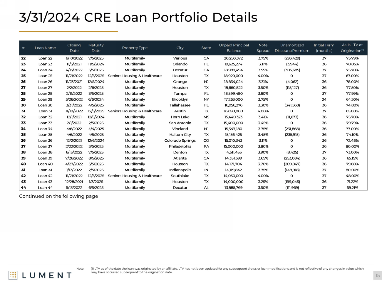 3/31/2024 CRE Loan Portfolio Details 14 Continued on the following page Note: (1) LTV as of the date the loan was originated by an affiliate. LTV has not been updated for any subsequent draws or loan modifications and is not reflective of any changes in value which may have occurred subsequent to the origination date. # Loan Name Closing Date Maturity Date Property Type City State Unpaid Principal Balance Note Spread Unamortized Discount/Premium Initial Term (months) As-Is LTV at Origination (1) 1 Loan 1 12/16/2021 1/3/2025 Multifamily Daytona FL 51,375,000 3.16% 0 37 71.70% 2 Loan 2 6/8/2021 7/5/2024 Multifamily Chattanooga TN 33,360,000 3.76% 0 37 79.76% 3 Loan 3 11/22/2019 4/5/2024 Multifamily Virginia Beach VA 33,227,466 4.11% 0 53 77.10% 4 Loan 4 3/22/2022 4/5/2025 Multifamily Seneca SC 31,876,244 3.35% (547,294) 37 74.54% 5 Loan 5 6/28/2022 7/3/2025 Multifamily Dallas TX 31,602,808 3.90% (449,810) 36 71.59% 6 Loan 6 12/29/2021 1/6/2025 Multifamily Multi NC 30,709,146 3.96% 0 36 59.90% 7 Loan 7 6/8/2021 7/5/2024 Multifamily Miami FL 30,576,666 3.31% 0 37 74.26% 8 Loan 8 5/20/2021 6/6/2024 Multifamily Marietta GA 30,220,508 3.21% (8,361) 37 77.02% 9 Loan 9 8/25/2022 9/5/2025 Multifamily Wilmington NC 28,653,440 4.00% 0 36 71.45% 10 Loan 10 6/7/2021 7/5/2024 Multifamily San Antonio TX 27,569,521 3.51% (2,165) 37 80.00% 11 Loan 11 11/2/2021 11/5/2024 Multifamily Melbourne FL 26,049,291 3.81% (153,724) 36 72.09% 12 Loan 12 8/26/2021 8/5/2024 Multifamily Clarkston GA 25,440,413 3.61% (728) 35 79.00% 13 Loan 13 11/15/2021 12/6/2024 Multifamily El Paso TX 24,330,000 3.21% 0 37 75.96% 14 Loan 14 10/18/2021 11/6/2024 Multifamily Cherry Hill NJ 23,348,000 3.11% 0 37 72.40% 15 Loan 15 8/26/2021 9/5/2024 Multifamily Union City GA 22,872,354 3.46% (2,501) 36 70.40% 16 Loan 16 4/27/2022 5/5/2025 Multifamily North Brunswick NJ 22,182,443 3.40% (119,952) 36 79.90% 17 Loan 17 3/22/2022 4/5/2025 Multifamily York PA 21,934,375 3.30% (489,334) 37 79.17% 18 Loan 18 11/16/2021 12/5/2024 Multifamily Dallas TX 21,916,753 3.31% (6,836) 37 73.54% 19 Loan 19 7/8/2022 8/5/2025 Multifamily Arlington TX 21,818,465 3.75% (288,166) 37 67.10% 20 Loan 20 8/31/2021 9/6/2024 Multifamily Houston TX 21,644,684 3.41% (1,454) 36 74.20% 21 Loan 21 11/29/2022 12/5/2025 Seniors Housing & Healthcare Glendale WI 20,360,000 4.00% 0 36 45.00%