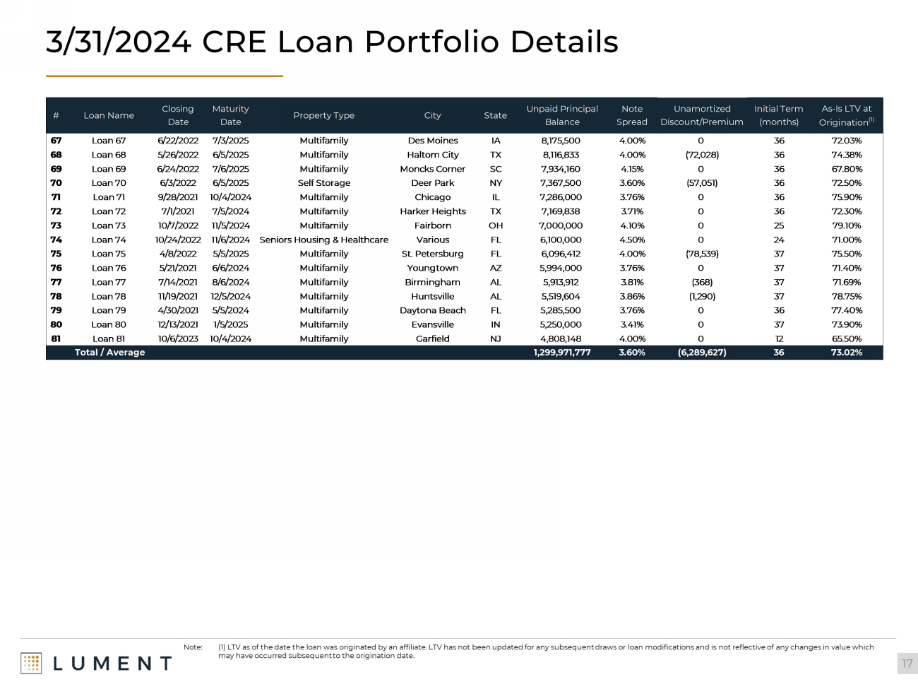 3/31/2024 CRE Loan Portfolio Details 16 Continued on the following page Note: (1) LTV as of the date the loan was originated by an affiliate. LTV has not been updated for any subsequent draws or loan modifications and is not reflective of any changes in value which may have occurred subsequent to the origination date. # Loan Name Closing Date Maturity Date Property Type City State Unpaid Principal Balance Note Spread Unamortized Discount/Premium Initial Term (months) As-Is LTV at Origination (1) 45 Loan 45 4/12/2021 5/5/2024 Multifamily Cedar Park TX 13,666,721 3.86% 0 37 66.70% 46 Loan 46 6/10/2022 7/5/2025 Multifamily Blakely PA 13,625,505 3.90% (93,166) 37 75.00% 47 Loan 47 10/6/2023 10/4/2024 Multifamily Garfield NJ 13,191,852 4.00% 0 12 65.50% 48 Loan 48 12/13/2021 1/5/2025 Multifamily Evansville IN 12,600,000 3.41% 0 37 74.30% 49 Loan 49 12/28/2021 1/3/2025 Multifamily Houston TX 12,322,717 3.25% (90,937) 36 71.20% 50 Loan 50 1/25/2022 2/6/2025 Multifamily Corpus Christi TX 12,249,079 3.55% (137,716) 36 78.76% 51 Loan 51 5/12/2022 6/5/2025 Multifamily Ypsilanti MI 11,926,591 3.50% (179,969) 37 68.40% 52 Loan 52 12/10/2021 1/5/2025 Multifamily Los Angeles CA 11,662,582 3.61% (261,761) 37 67.93% 53 Loan 53 3/4/2022 3/5/2025 Multifamily Houston TX 11,467,505 3.45% (248,625) 36 78.30% 54 Loan 54 4/14/2022 5/5/2025 Multifamily Irving TX 11,287,602 3.50% (182,312) 37 74.90% 55 Loan 55 10/28/2021 11/6/2024 Multifamily Tampa FL 11,202,535 3.06% 0 36 75.70% 56 Loan 56 4/23/2021 5/6/2024 Multifamily Tualatin OR 10,986,357 3.31% (684) 36 73.90% 57 Loan 57 5/3/2022 5/5/2025 Multifamily Port Richey FL 10,818,945 3.55% (215,083) 36 79.05% 58 Loan 58 9/30/2021 10/4/2024 Multifamily Clearfield UT 10,795,000 3.26% 0 36 67.98% 59 Loan 59 12/29/2021 1/3/2025 Multifamily Phoenix AZ 10,615,094 3.76% (5,400) 36 75.90% 60 Loan 60 6/28/2022 7/4/2025 Multifamily Colorado Springs CO 10,531,845 3.90% 0 36 73.06% 61 Loan 61 12/2/2021 12/6/2024 Multifamily Tomball TX 9,975,000 3.51% 0 36 68.50% 62 Loan 62 11/23/2021 12/5/2024 Multifamily Atlanta GA 9,856,000 3.46% 0 36 79.50% 63 Loan 63 1/14/2022 2/5/2025 Multifamily Houston TX 9,609,250 3.60% 0 37 78.76% 64 Loan 64 7/14/2022 8/5/2025 Multifamily Bradenton FL 9,429,206 3.90% (73,762) 37 74.40% 65 Loan 65 8/5/2022 8/5/2025 Multifamily San Antonio TX 9,127,649 4.35% (41,043) 36 75.00% 66 Loan 66 10/29/2021 11/5/2024 Multifamily Riverside MO 8,717,380 3.51% (5,008) 36 76.60%